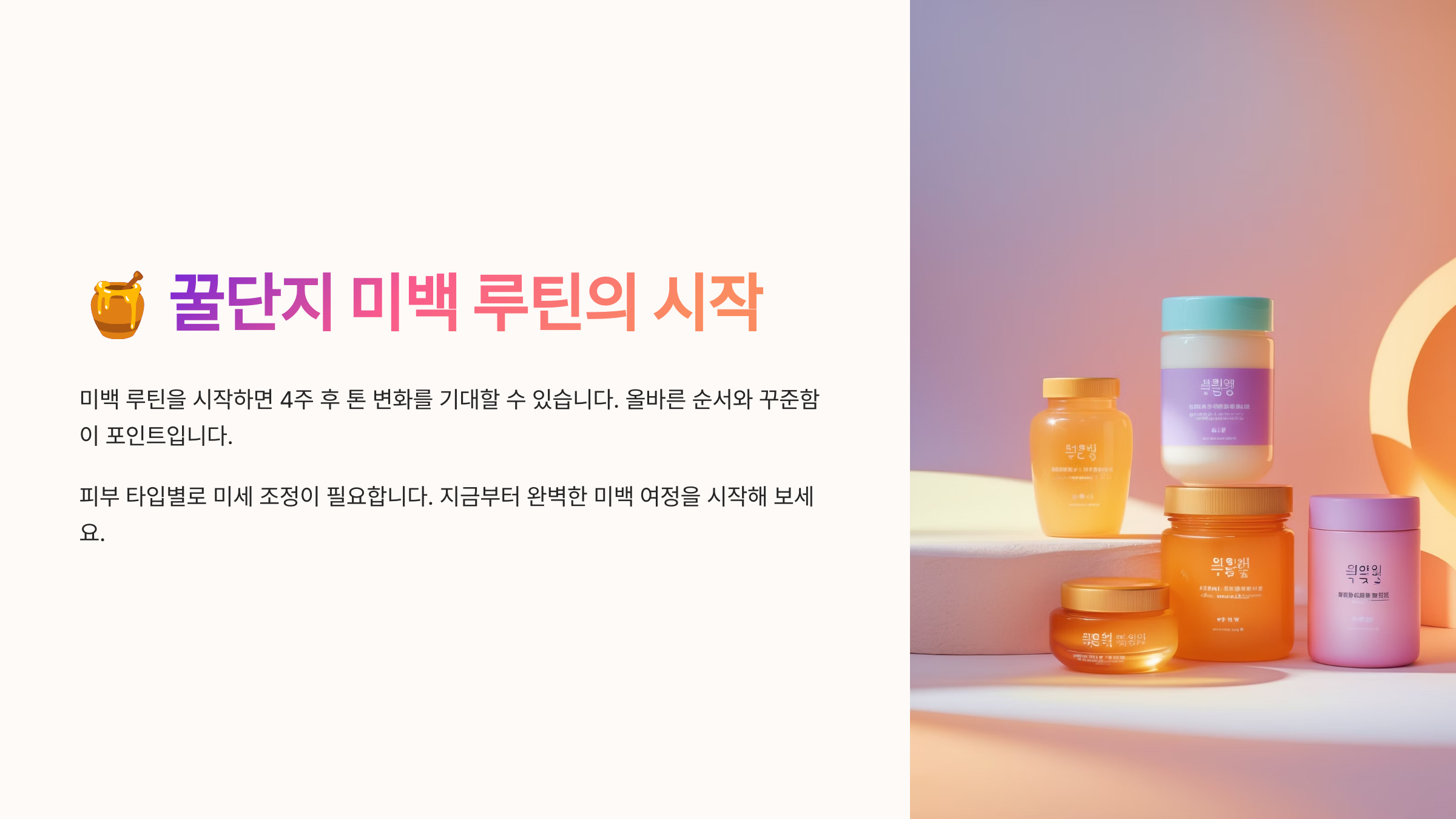 ๊ฟ๋จ์ง ๋ฏธ๋ฐฑ ๋ฃจํด์ ์์ฑํ๋ ค๋ฉด ํต์ฌ ์ฌ๋ฃ์ ์ฑ๋ถ์ ์์์ผ ํด์. ์ด ๋ฃจํด์ ์ฃผ์ธ๊ณต์ ๋ฐ๋ก ๊ฟ์ด์์. ๊ฟ์๋ ํ๋ถํ ๋นํ๋ฏผ๊ณผ ๋ฏธ๋ค๋, ํญ์ฐํ ๋ฌผ์ง์ด ๋ค์ด์์ด ํผ๋ถ๋ฅผ ๋ง๊ณ ๊ฑด๊ฐํ๊ฒ ๊ฐ๊พธ์ด์ค์.