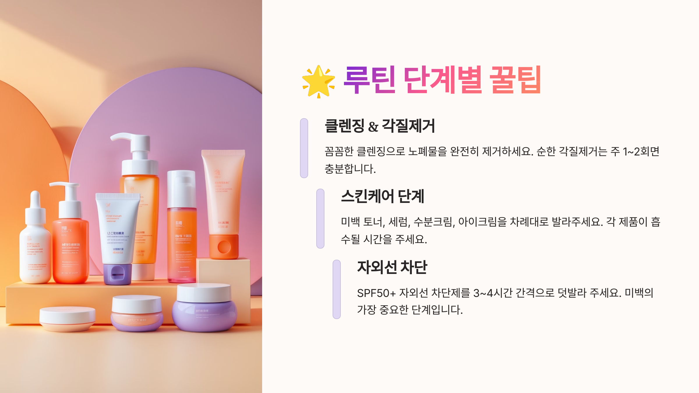 ๋จ๊ณ๋ณ๋ก ๋ฃจํด์ ์ ์งํค๋ฉด, ํผ๋ถํค์ด ํ์ธต ๋ฐ์์ง๋ ๊ฑธ ๋๋ ์ ์์ด์. ๊ทธ๋ฆฌ๊ณ ๊พธ์คํ ํ๋ ๊ฒ ์ ๋ง ์ค์ํด์! ํผ๋ถ๋ ์ด๋์ฒ๋ผ ๊ท์น์ ์ผ๋ก ๊ด๋ฆฌํ ๋ ์ง์ง ํจ๊ณผ๋ฅผ ๋ณด๊ฑฐ๋ ์. ๐ง