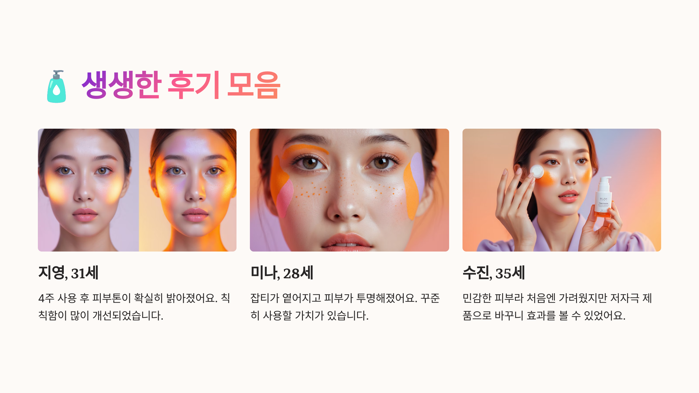์ธ ๊ฐ์ง ์ฌ๋ฃ์ ์๋์ง ํจ๊ณผ๊ฐ ๋๋จํด์. ๊ฐ๊ฐ์ ์ญํ ์ด ๋ถ๋ช ํด์ ํผ๋ถ๊ฐ ์ ์ ๋ง๊ณ ํฌ๋ช ํด์ง๋ ๊ฑธ ๋๋ ์ ์๋ต๋๋ค. ๐