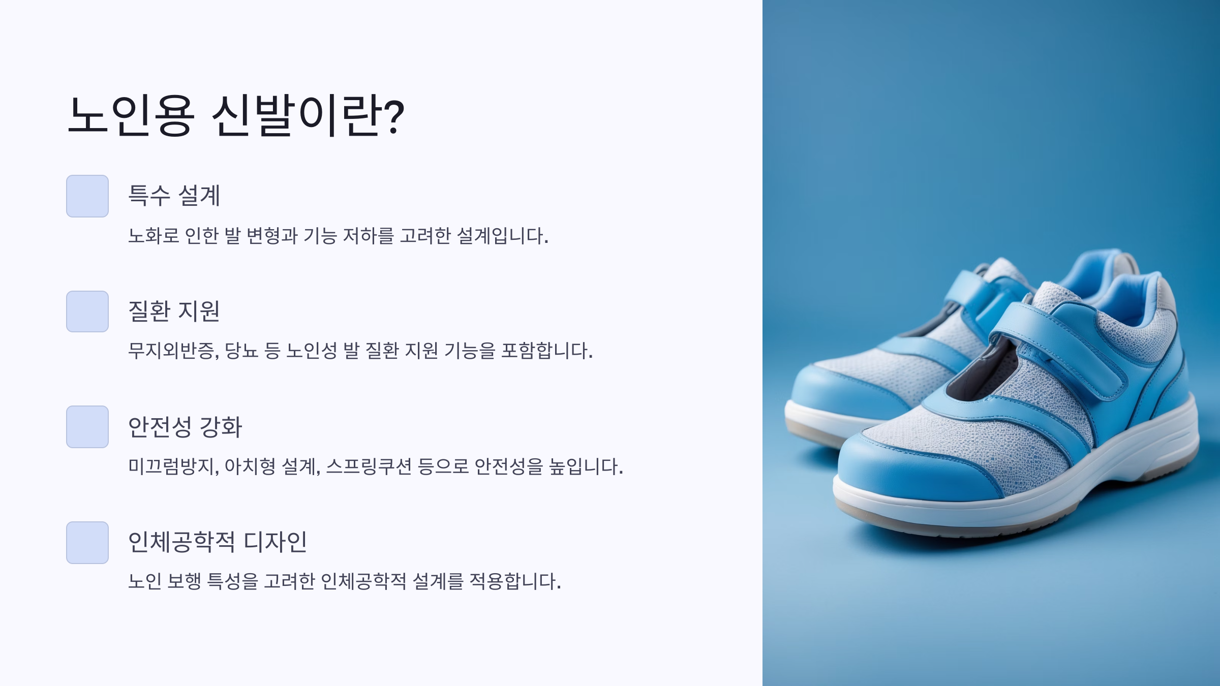 ๋ ธ์ธ์ฉ ์ ๋ฐ์ ๋จ์ํ 'ํธํ ์ ๋ฐ'์ ๋์ด ๊ณ ๋ น์์ ์ถ์ ์ง์ ๊ฒฐ์ ์ง๋ ์ค์ํ ๊ฑด๊ฐ ๋ณด์กฐ๋๊ตฌ์์. ์ผ๋ฐ์ ์ธ ์ ๋ฐ๊ณผ๋ ๋ฌ๋ฆฌ ๋ฐ์ ์๋ฆฌ์ ๊ตฌ์กฐ, ๊ท ํ๊ฐ๊ฐ ์ฝํ, ๊ทผ์ก ๊ฐ์ ๋ฑ์ ๊ณ ๋ คํด ์ค๊ณ๋ ํน์ ์ค๊ณ ์ ๋ฐ์ด๋๋๋ค.