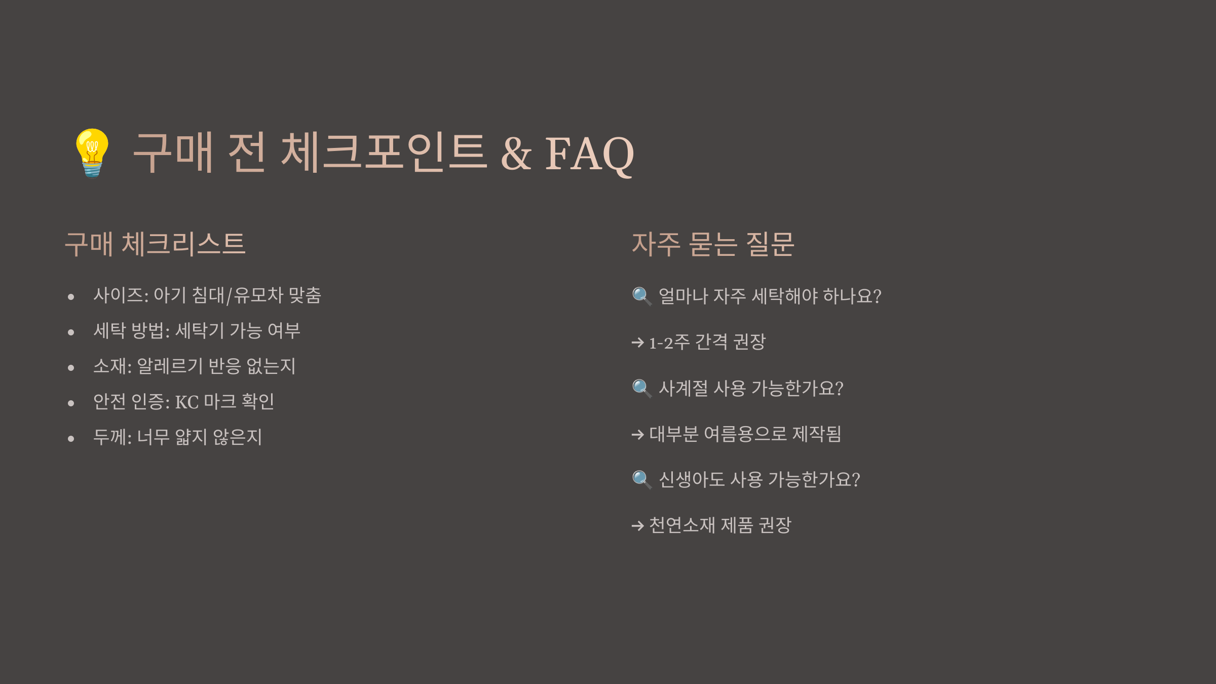 | 오가닉 코튼 | 자극 없음, 부드러움 | 세탁기 가능 (저온) |