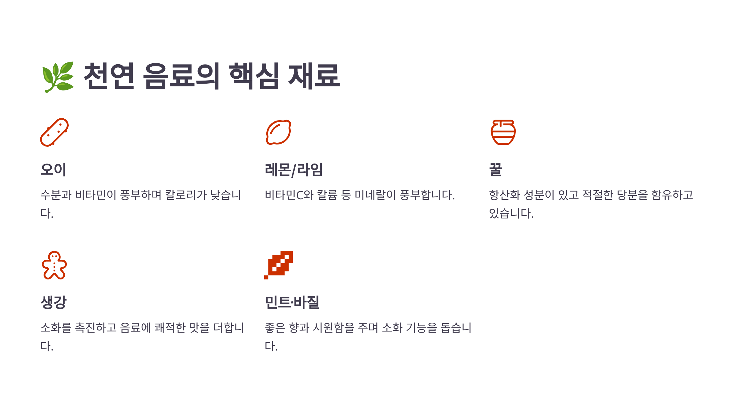 ๋ํ์ ์ผ๋ก ๋ง์ด ์ฐ์ด๋ ์ฌ๋ฃ๋ ์ค์ด, ๋ ๋ชฌ, ์๊ฐ, ๋ฐฐ, ์ฌ๊ณผ, ์๋ชฝ, ๊นป์, ๋ฐํ, ๋ณด๋ฆฌ์ฐจ, ๋งค์ค์ด์์. ์ด ์ฌ๋ฃ๋ค์ ํด๋ ์์ฉ๊ณผ ํจ๊ป ์๋ถ ๋ณด์ถฉ ํจ๊ณผ๊ฐ ๋ฐ์ด๋๊ณ ๋ง๋ ์ํด์ ์ด๋ฅด์ ์ ๋ง์ ๋ฑ ๋ง๋๋ต๋๋ค.