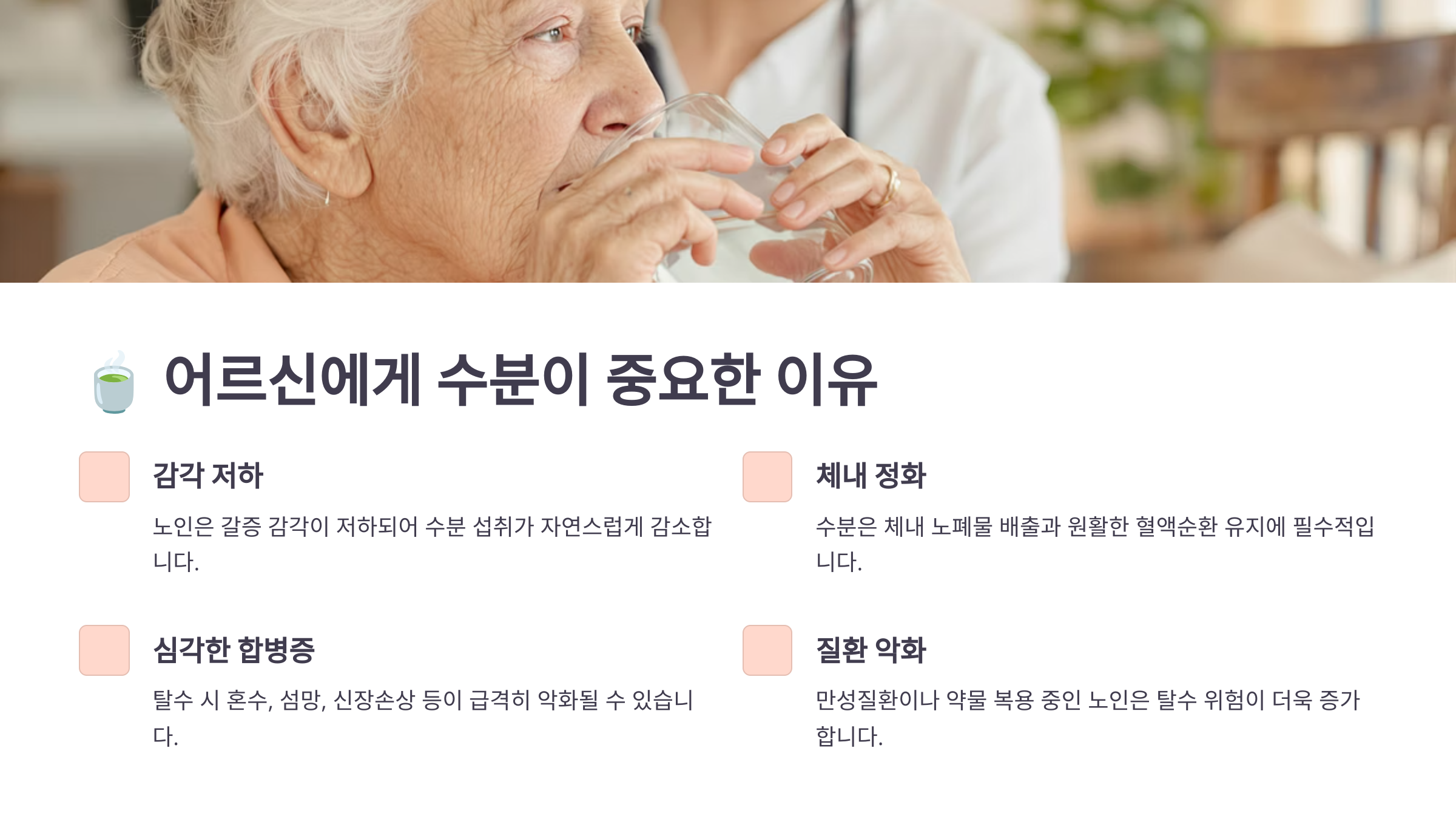 ์ด๋ฅด์ ๋ค์ ์ ์ฒด ๊ตฌ์กฐ์ ์๋ฆฌ ๊ธฐ๋ฅ์ ๋ณํ๋ก ์ธํด ์๋ถ์ด ์ฝ๊ฒ ์์ค๋๊ณ , ์ด๋ฅผ ๋ณด์ถฉํ๋ ๋ฅ๋ ฅ๋ ๋จ์ด์ง๋ ํธ์ด์์. ๋์ด๊ฐ ๋ค์๋ก ๊ฐ์ฆ์ ๋๋ผ๋ ๊ฐ๊ฐ์ด ๋ํด์ง๊ณ , ์ ์ฅ์ด ์๋ถ์ ์ ์งํ๋ ๊ธฐ๋ฅ๋ ์ฝํด์ง๊ธฐ ๋๋ฌธ์ด์์.