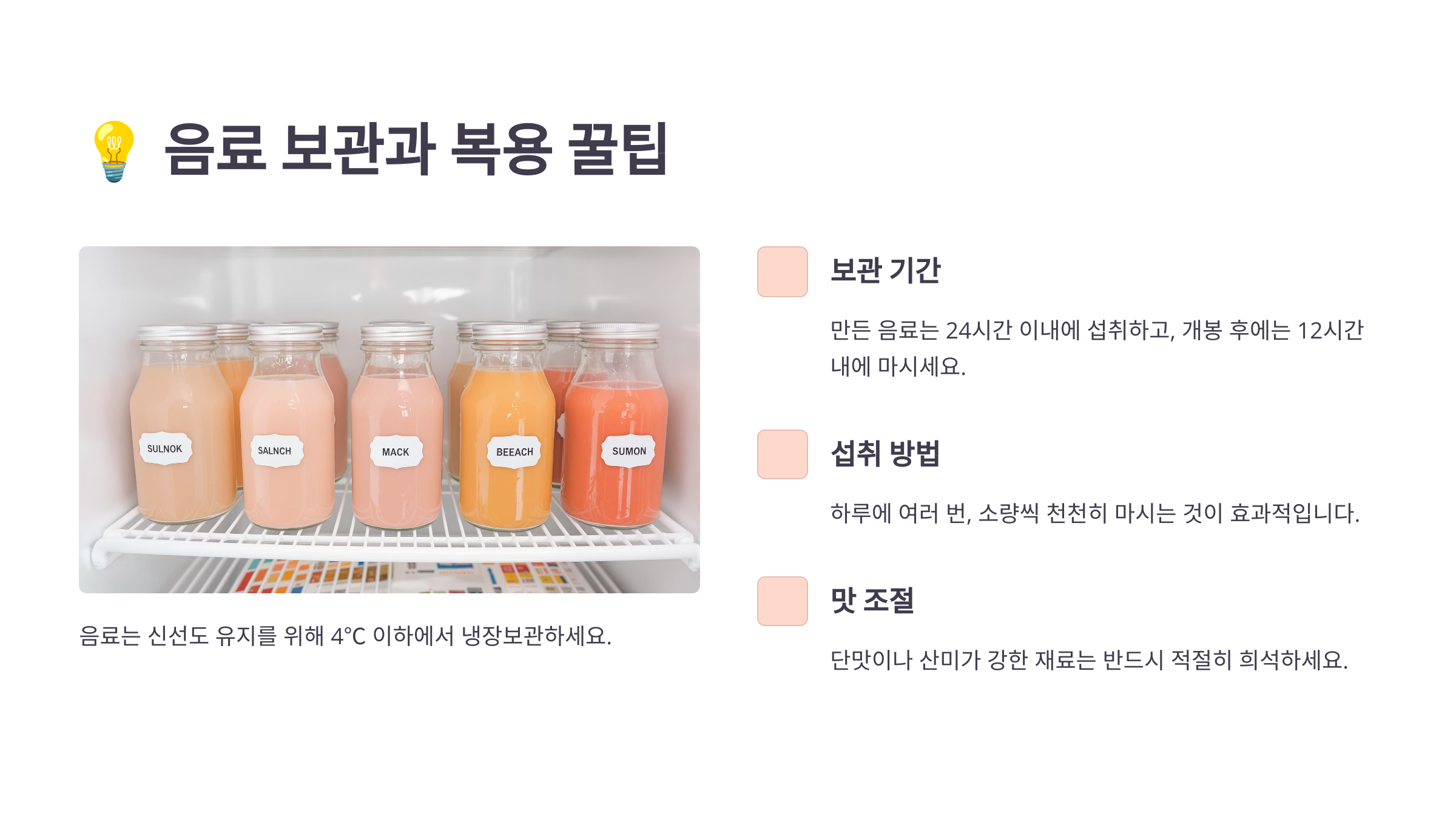 ๋ํ ์๋ฃ๋ฅผ ๋๋ฌด ์ฐจ๊ฒ ํด์ ๋์๋ ๊ฒ๋ ์ฃผ์ํด์ผ ํด์. ๋๋ฌด ์ฐฌ ์๋ฃ๋ ์์ฅ์ ์๊ทนํ ์ ์๊ธฐ ๋๋ฌธ์, ๋์ฅ๊ณ ์์ ๊บผ๋ธ ํ ์ ์ ์ค์จ์ ๋๊ณ ๋์๋ ๊ฑธ ๊ถ์ฅํด์. โ๏ธ