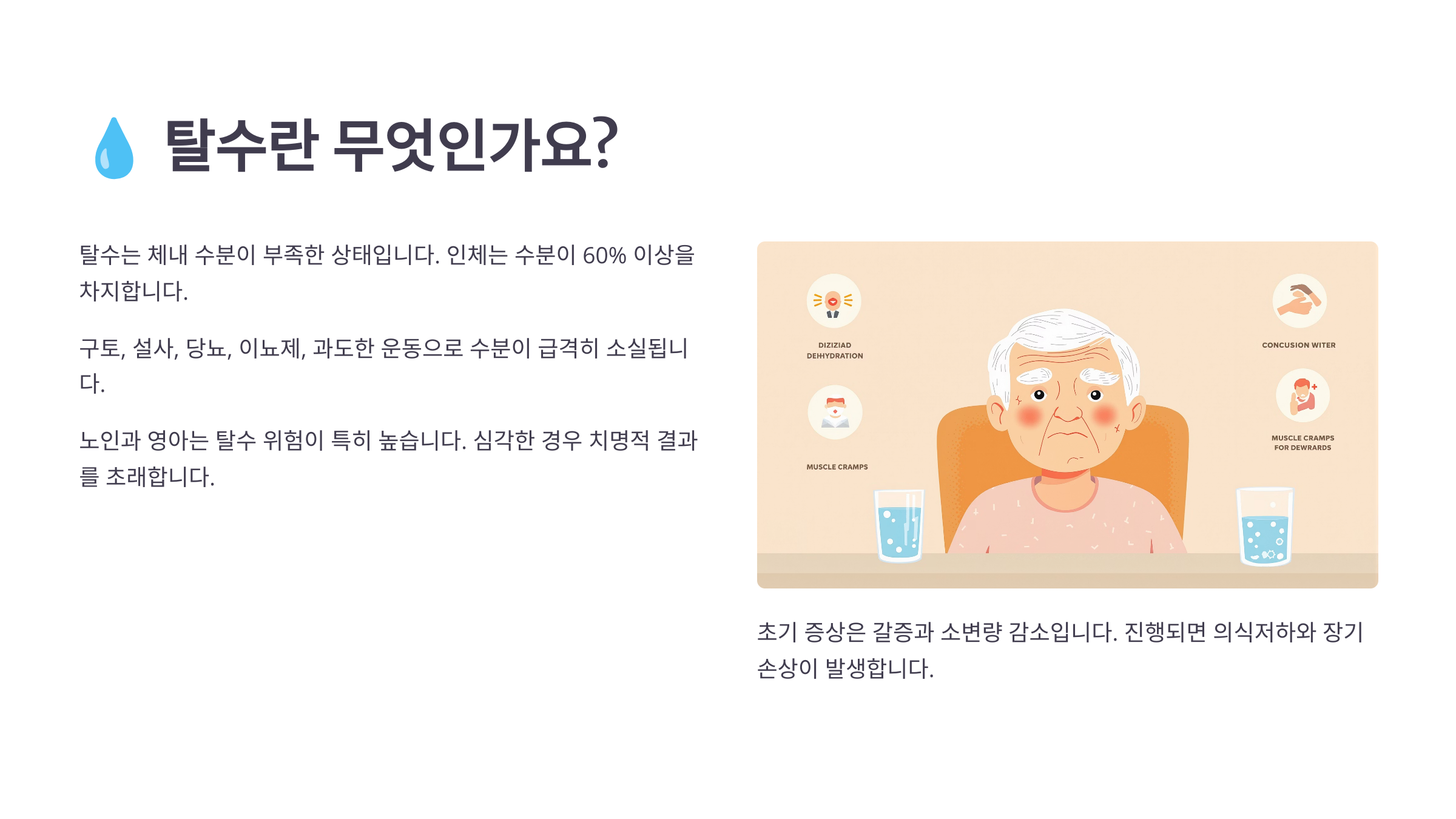 ํ์๋ ์ฐ๋ฆฌ ๋ชธ์ ์๋ถ์ด ๋ถ์กฑํด์ง๋ ์ํ๋ฅผ ๋งํด์. ํนํ ๋, ์๋ณ, ํธํก์ ํตํด ์๋ถ์ด ๋น ์ ธ๋๊ฐ๋ฉด์ ๋ณด์ถฉ์ด ๋์ง ์์ผ๋ฉด ์ฒด๋ด ์๋ถ ๊ท ํ์ด ๋ฌด๋์ง๊ฒ ๋์ฃ . ์ด๋ฅด์ ๋ค์ ๊ฐ์ฆ์ ๋๋ผ๋ ๊ธฐ๋ฅ์ด ๋จ์ด์ง๊ณ ์ ์ฅ ๊ธฐ๋ฅ๋ ์ฝํด์ง๊ธฐ ๋๋ฌธ์ ํ์์ ๋ ์ทจ์ฝํด์.