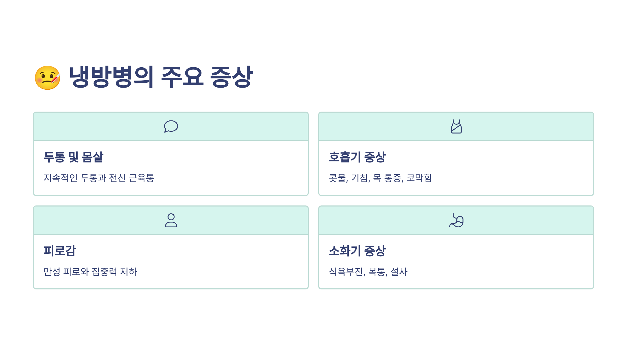 | 주요 증상 | 발열, 기침, 콧물 | 두통, 피로, 오한 |