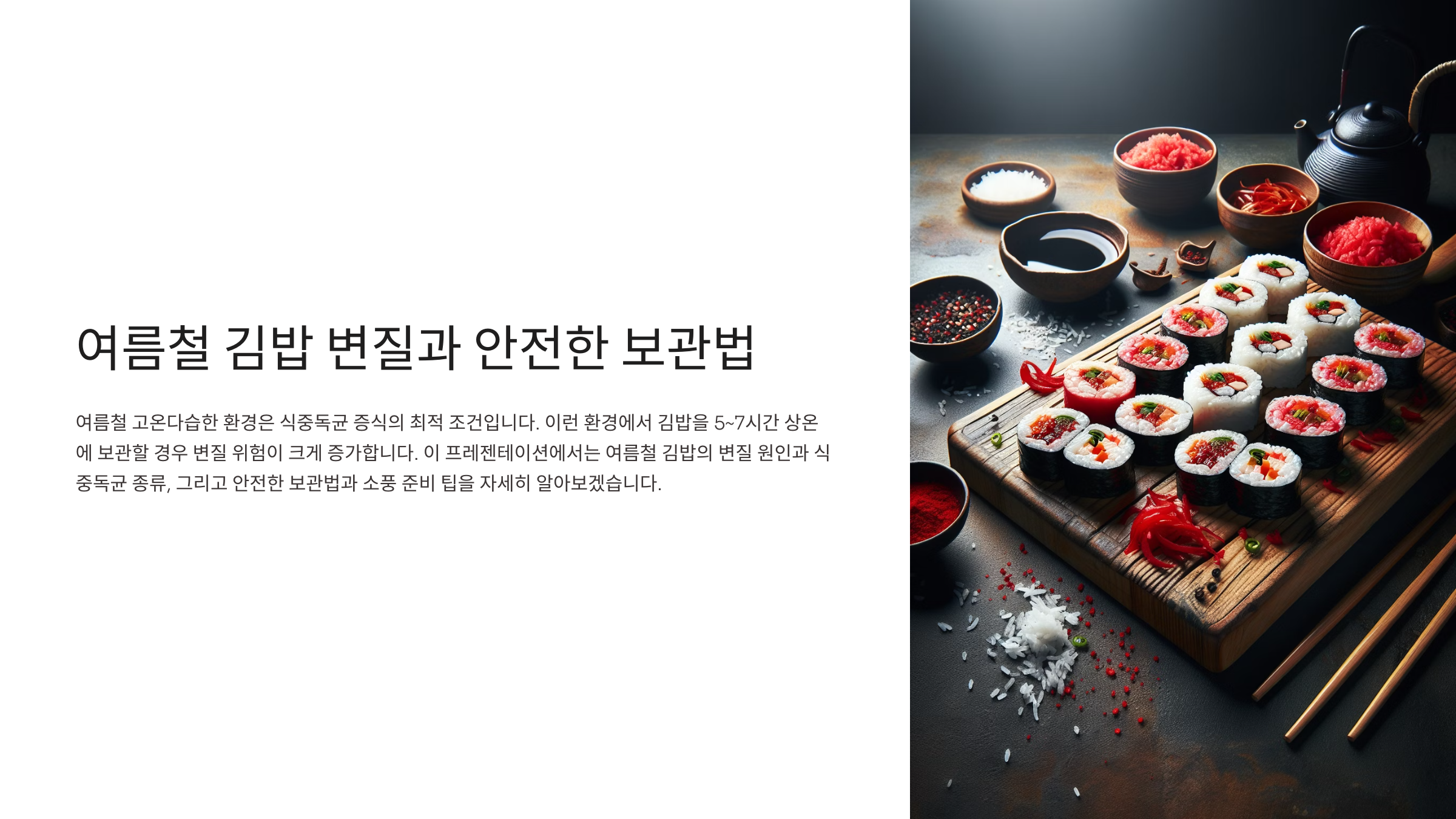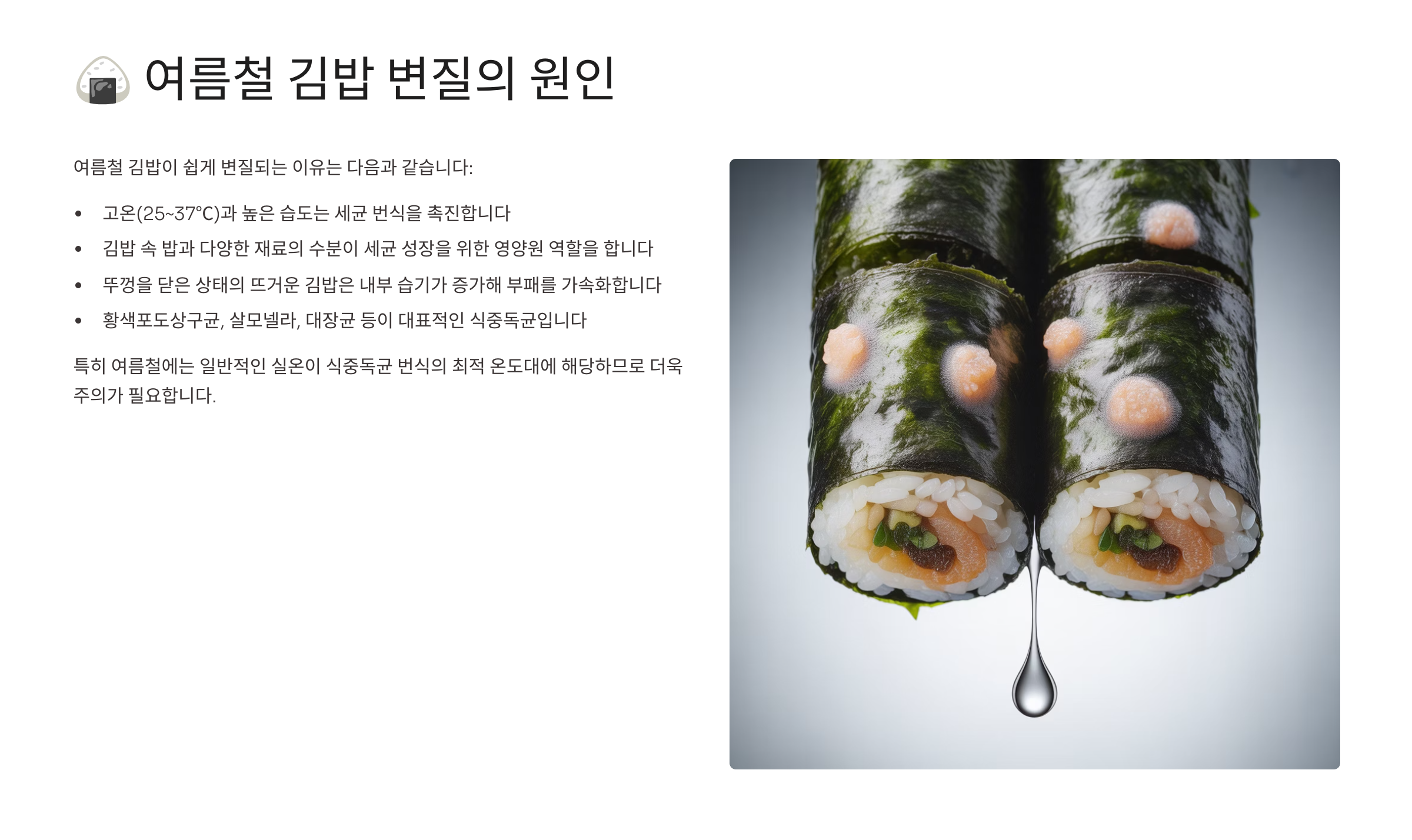 ์ด๋ฌํ ๊ท ๋ค์ ๊น๋ฐฅ์ ์ฌ๋ฃ ํน์ฑ๊ณผ ๋ง๋ฌผ๋ ค ์ฌ๋ฆ์ฒ ์์ค๋ ๋ฐ์๋ฅ ์ ๊ธ๊ฒฉํ ๋์ด๋ ์์ธ์ด ๋๊ธฐ ๋๋ฌธ์, ๋ฐ๋์ ์กฐ์ฌํด์ผ ํด์.