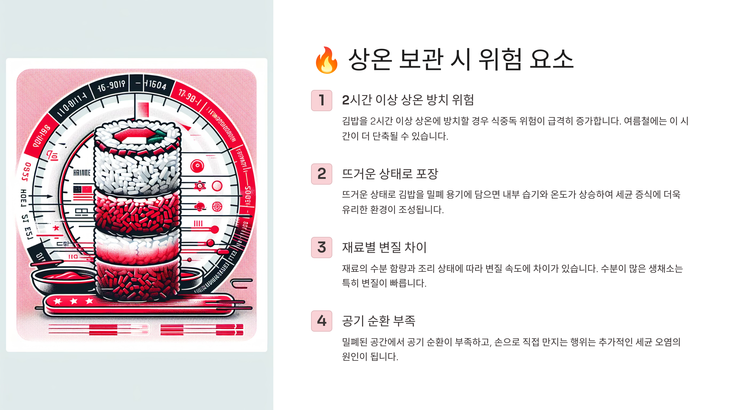 ํนํ ์ฌ๋ฆ์ ํ๊ท ๊ธฐ์จ์ด 30๋์ ๊ฐ๊น์ด ๋ ์ด ๋ง์์ ์ธ๊ท ์ฆ์ ์๋๊ฐ ๋งค์ฐ ๋นจ๋ผ์. ์์จ์์ 2์๊ฐ ์ด์ ๋์ธ ์์์ ์ด๋ฏธ ์ํํ๋ค๋ ๊ฒ ์ํ์์ฝํ์์ ์ฒ์ ๊ณต์ ์ ์ฅ์ด์์. ๊ทธ๋์ ์ฌ๋ฆ ๊น๋ฐฅ์ 3์๊ฐ์ ๋๊ธฐ์ง ์๋ ๊ฒ์ด ๊ธฐ๋ณธ ์์น์ด์์.