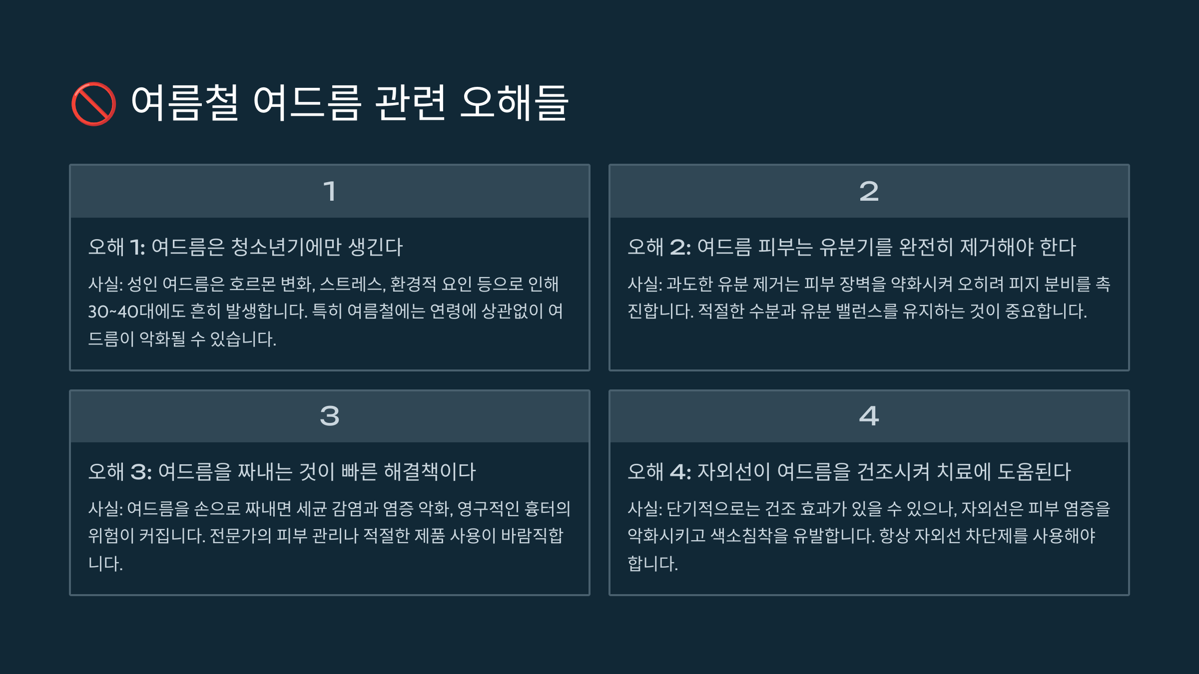 여름철 여드름과 관련해 많은 사람들이 믿고 있는 오해들이 있어요. 이런 잘못된 정보들은 오히려 피부를 망치는 원인이 되기도 해요.