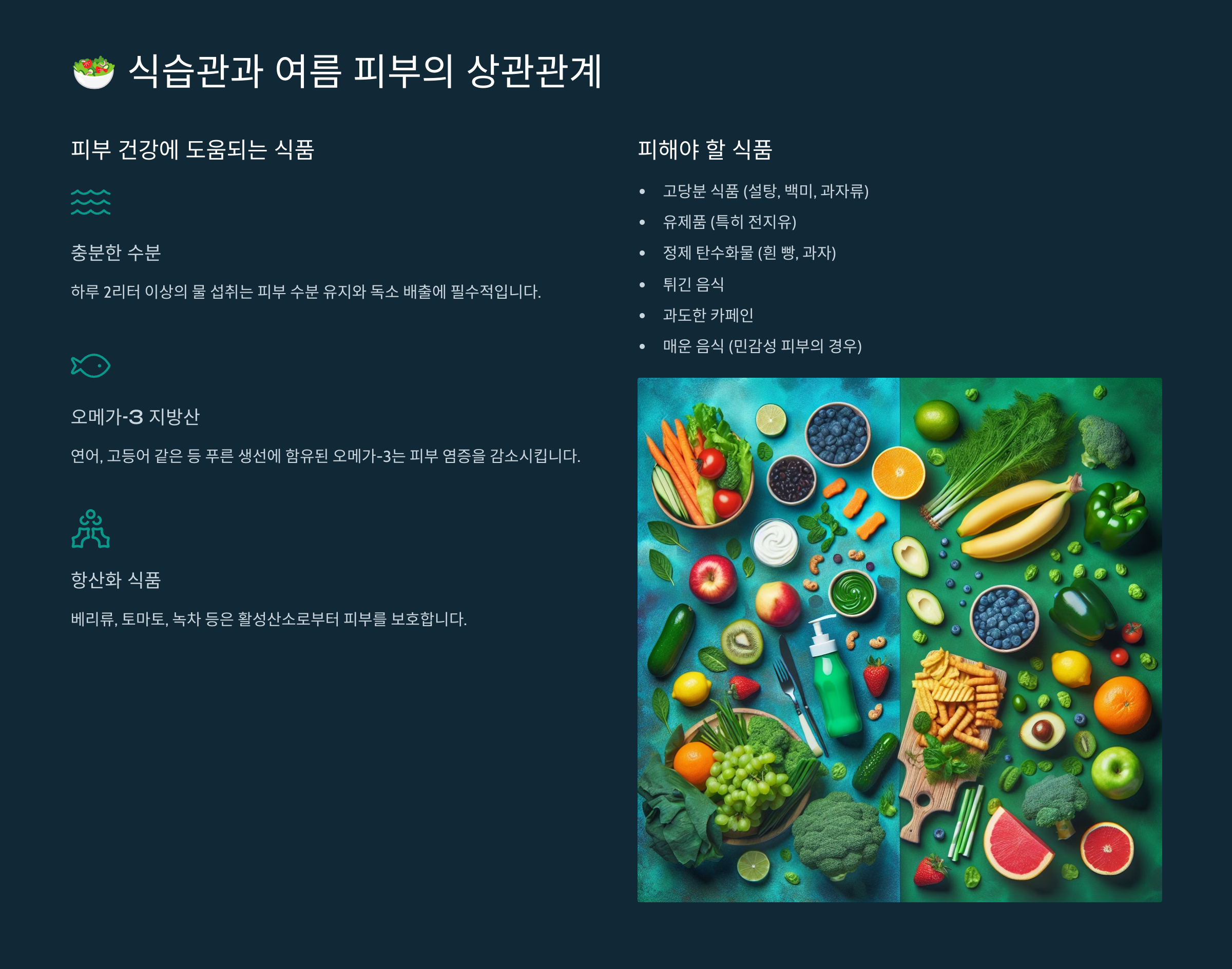 여름철 여드름이 단순히 세안 문제라고 생각했다면, 식습관도 반드시 짚고 넘어가야 해요. 우리가 먹는 음식은 피부 속 피지 분비에 직접적인 영향을 준답니다.