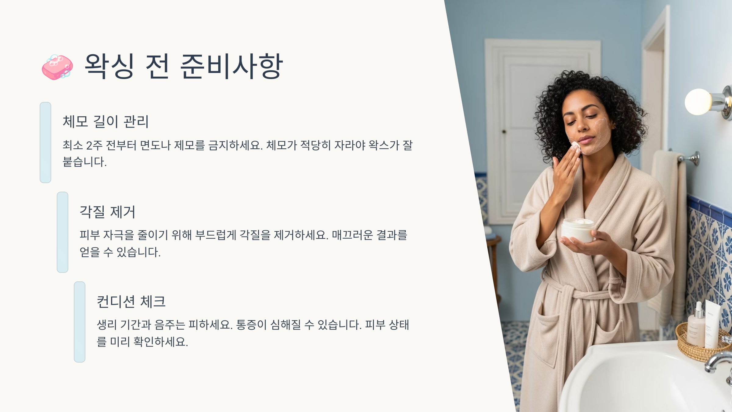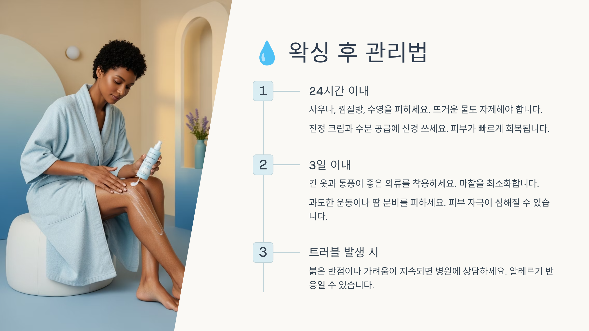 ์์ฑ ํ 2~3์ผ ๋์์ ํผ๋ถ๊ฐ ์๋ฏผํ๋ฏ๋ก ๊ฐ์ง ์ ๊ฑฐ๋ ๊ฐํ ๋ง์ฐฐ์ ์ ๋ ํผํด์ผ ํด์. ์ด ์๊ธฐ์๋ ์ํ ๋ฐ๋์์์ ๋ถ๋๋ฌ์ด ์๊ฑด์ผ๋ก ๊ด๋ฆฌํ๋ ๊ฒ์ด ๊ธฐ๋ณธ์ด์์.