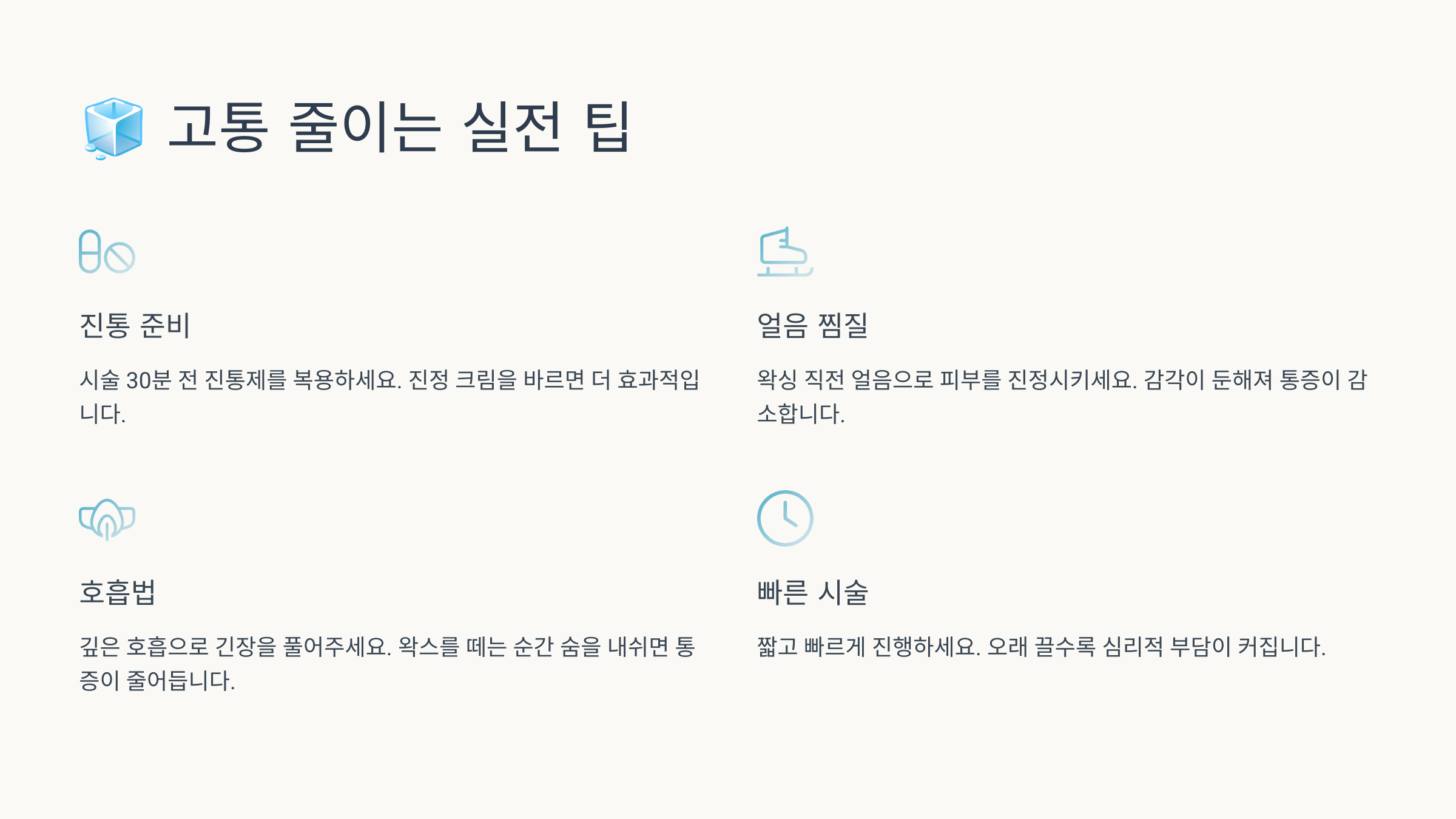 A4. ์ฒ์์ ํต์ฆ์ด ์์ง๋ง, ๋ฐ๋ณตํ ์๋ก ๋ ์ํ๊ณ ์ ์๋ผ์. ํ๋ฆฌ์์ค ์ค์ผ์ด๋ ๋ฌดํต ํฌ๋ฆผ์ ํ์ฉํ๋ฉด ๊ณ ํต์ ์ค์ผ ์ ์์ด์.