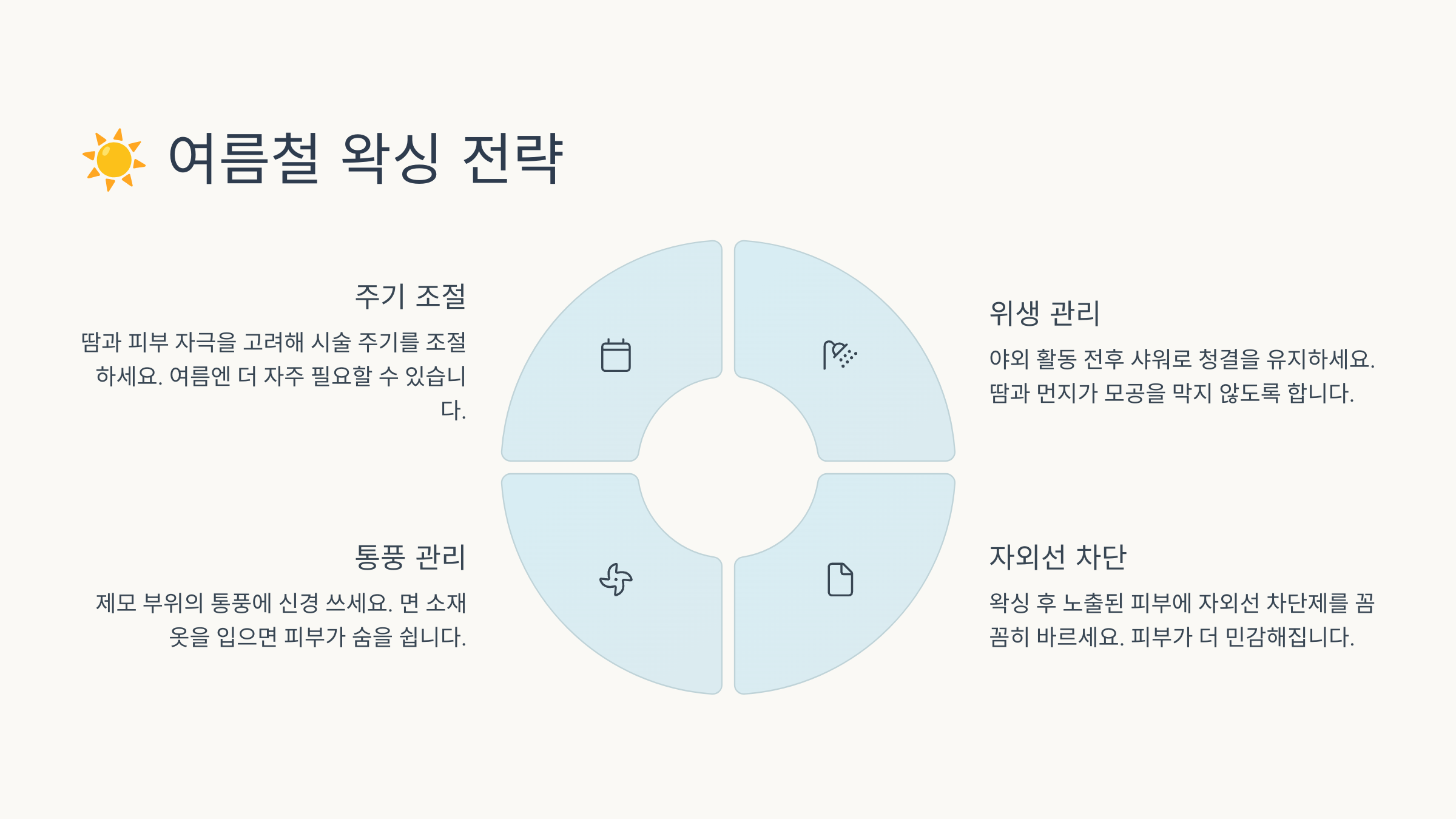์ฌ๋ฆ์๋ ํผ๋ถ ๋ ธ์ถ์ด ๋ง๊ธฐ ๋๋ฌธ์ ์์ ๊ฐ๋ ์ค์ํด์. ์์ฑ์ ํตํด ํผ๋ถ๋ฅผ ๋งค๋ํ๊ฒ ์ ๋ฆฌํ๊ณ , ๋๊ณผ ๋์๋ก๋ถํฐ ์์ ๋ก์์ง ์ ์์ด์. ๊ทธ๋์ ์ฌ๋ฆ์ฒ ์์ฑ์ ๋จ์ํ ์ ๋ชจ๊ฐ ์๋๋ผ ๋ผ์ดํ ์คํ์ผ ๊ด๋ฆฌ๋ผ๊ณ ํ ์ ์์ด์.