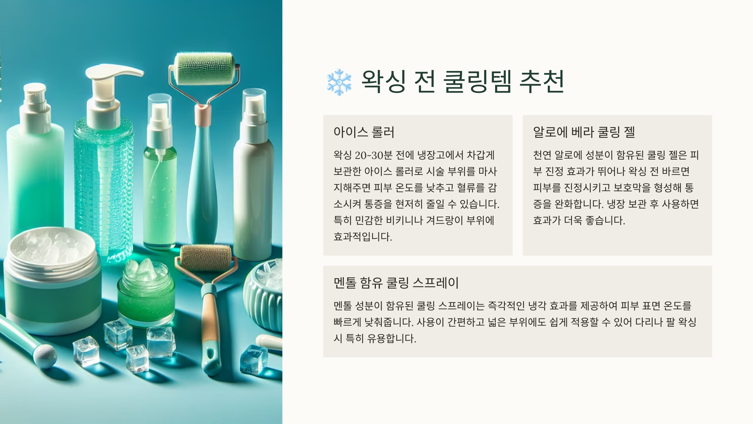 ๋ง์ง๋ง์ผ๋ก ์ถ์ฒํ๋ ๊ฑด ํด๋์ฉ ์์ด์คํฉ์ด์์. ์์ฑ 10๋ถ ์ ๋์ฐ์ง์ฒ๋ผ ํผ๋ถ์ ๋๊ณ ์์ผ๋ฉด ํผ๋ถ ์จ๋๋ฅผ ๋ฎ์ถ๊ณ , ํ๊ด์ ์์ถ์์ผ์ ํต์ฆ์ ์ค์ฌ์ค์. ๋ฌผ๋ฆฌ์ ์ผ๋ก ํ์คํ๊ฒ ํผ๋ถ๋ฅผ ์์ ์ํฌ ์ ์์ด์ ๋ง์ ์์ฑ ์์์๋ ์ด ๋ฐฉ๋ฒ์ ์ฌ์ฉํ๋ต๋๋ค.