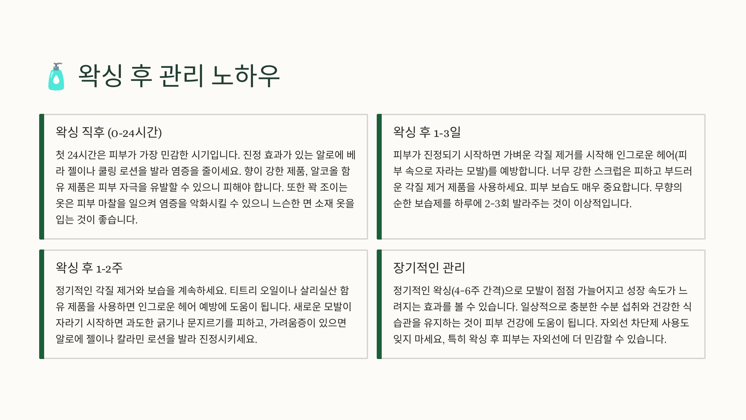 ์์ฑ ํ ๊ด๋ฆฌ๊ฐ ์ ๋๋ก ๋์ง ์์ผ๋ฉด ๋ถ์๊ธฐ, ๋พฐ๋ฃจ์ง, ๋ชจ๋ญ์ผ ๊ฐ์ ๋ฌธ์ ๋ค์ด ์๊ธฐ๊ธฐ ์ฌ์์. ์ฒซ 24์๊ฐ์ ํนํ ์ค์ํ ์๊ฐ์ด๊ธฐ ๋๋ฌธ์ ํผ๋ถ ์๊ทน์ ์ต๋ํ ์ค์ฌ์ผ ํด์.