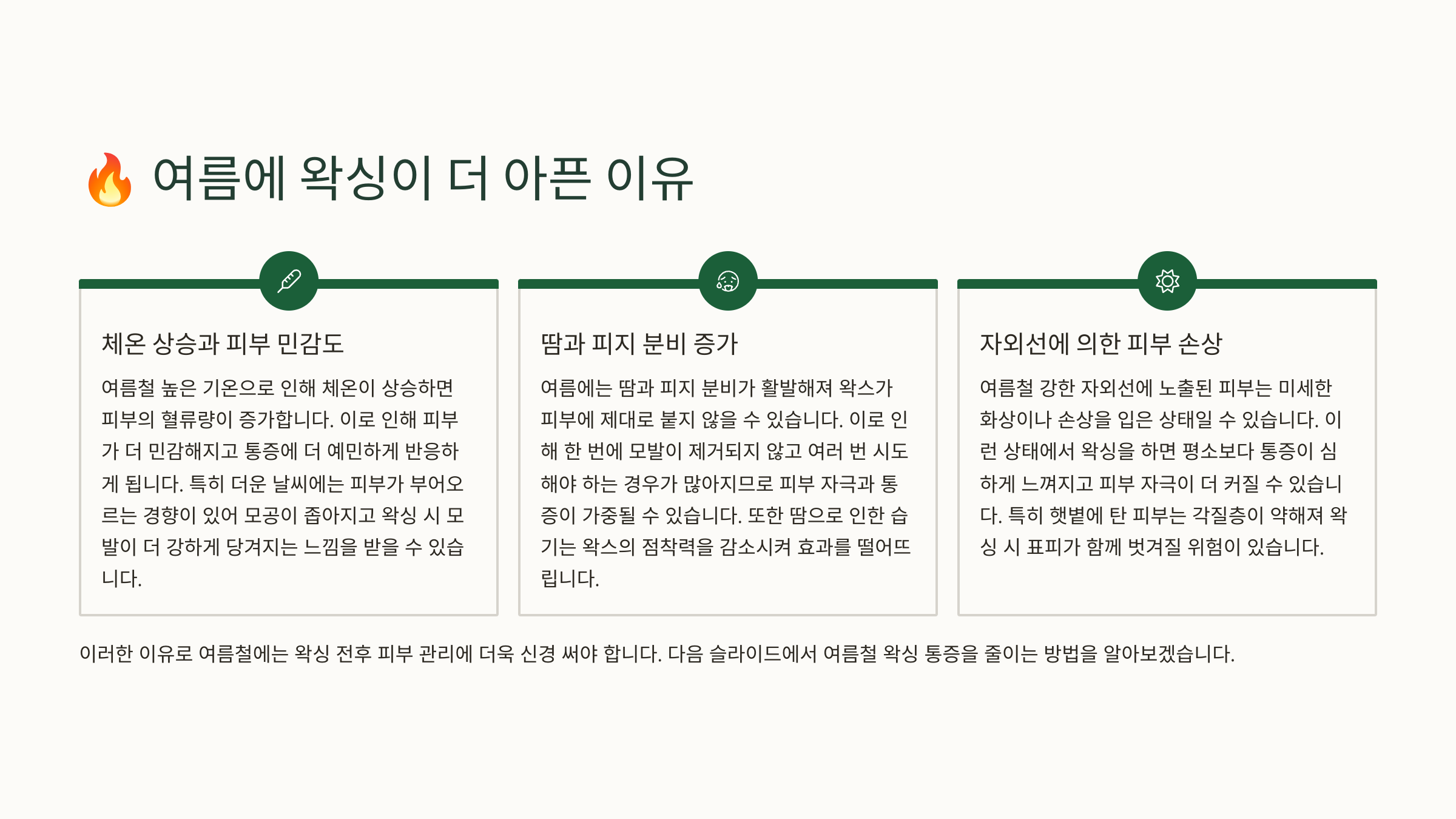 ์ฌ๋๋ง๋ค ํต์ฆ์ ๋ํ ๋ฐ์์ ๋ค๋ฅด์ง๋ง, ์ ๋ ์ฌ๋ฆ์ฒ ์ ์์ฑ์ด ๋ ์ํ๊ฒ ๋๊ปด์ง๋ค๋ฉด ๊ทธ ์ด์ ๊ฐ ์์ด์. ์ฌ๋ฆ์๋ ๊ธฐ๋ณธ์ ์ผ๋ก ์ฒด์จ์ด ์ฌ๋ผ๊ฐ ์๊ณ , ๋์ด ๋ง์์ ธ์ ํผ๋ถ๊ฐ ์๋ฏผํ ์ํ๊ฐ ๋๊ธฐ ์ฌ์์.