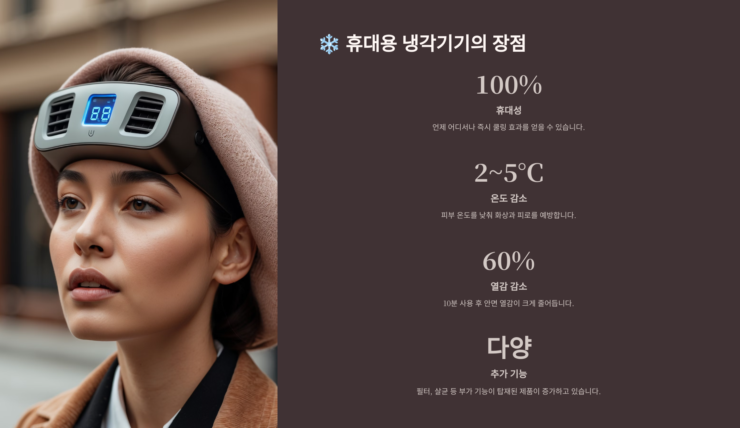 ์ด์ฒ๋ผ ๋๊ฐ๊ธฐ๊ธฐ๋ ๋ชฉ์ ์ ๋ง์ถฐ์ ์ ํํ ์ ์์ด์. ํนํ ์ฌ๋ฆ์๋ ์ธ์ ์ด๋์๋ ์ฟจ๋ง ํจ๊ณผ๋ฅผ ๋๋ฆด ์ ์์ผ๋๊น ๋๋ฌด ํธ๋ฆฌํ์ฃ . ๋จ์ํ ์์ด์ปจ ๋ฐ๋์ ์์กดํ์ง ์์๋ ๋๋ ๊ฒ๋ ๋งค๋ ฅ์ ์ด์์.