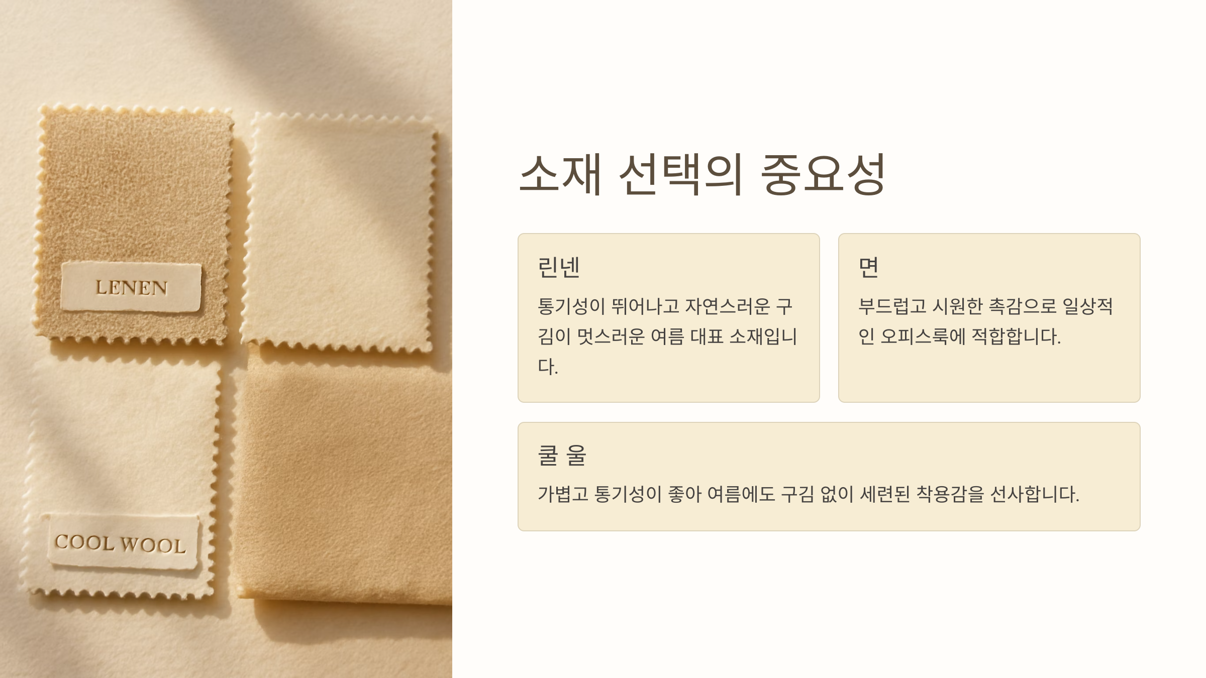 ์ฌ๋ฆ ์ถ๊ทผ๋ฃฉ์์ ๊ฐ์ฅ ๋จผ์ ๊ณ ๋ คํด์ผ ํ ๊ฒ์ '๋จ์ ํจ'๊ณผ '์พ์ ํจ'์ด์์. ์๋ฌด๋ฆฌ ์์ํด ๋ณด์ฌ๋ ๋๋ฌด ๋ ธ์ถ์ด ์ฌํ๊ฑฐ๋ ์บ์ฃผ์ผํ ์คํ์ผ์ ํ์ฌ์์ ๋ค์ ๋ถ์ ์ ํ ์ ์๋ต๋๋ค. ๊ทธ๋์ ์ฌ๋ฆ ์ถ๊ทผ๋ฃฉ์์๋ ์์ง๋ง ๋น์นจ์ด ์ ๊ณ , ์กฐ์ง๊ฐ์ด ํํํ ์์ฌ๋ฅผ ํ์ฉํ๋ ๊ฒ์ด ์ข์์. ์ฌ๋ฆ์ฉ ์์ผ์ด๋ ๋ฆฐ๋จ ์ ์ธ ๊ฐ ๋ํ์ ์ธ ์์ฃ .