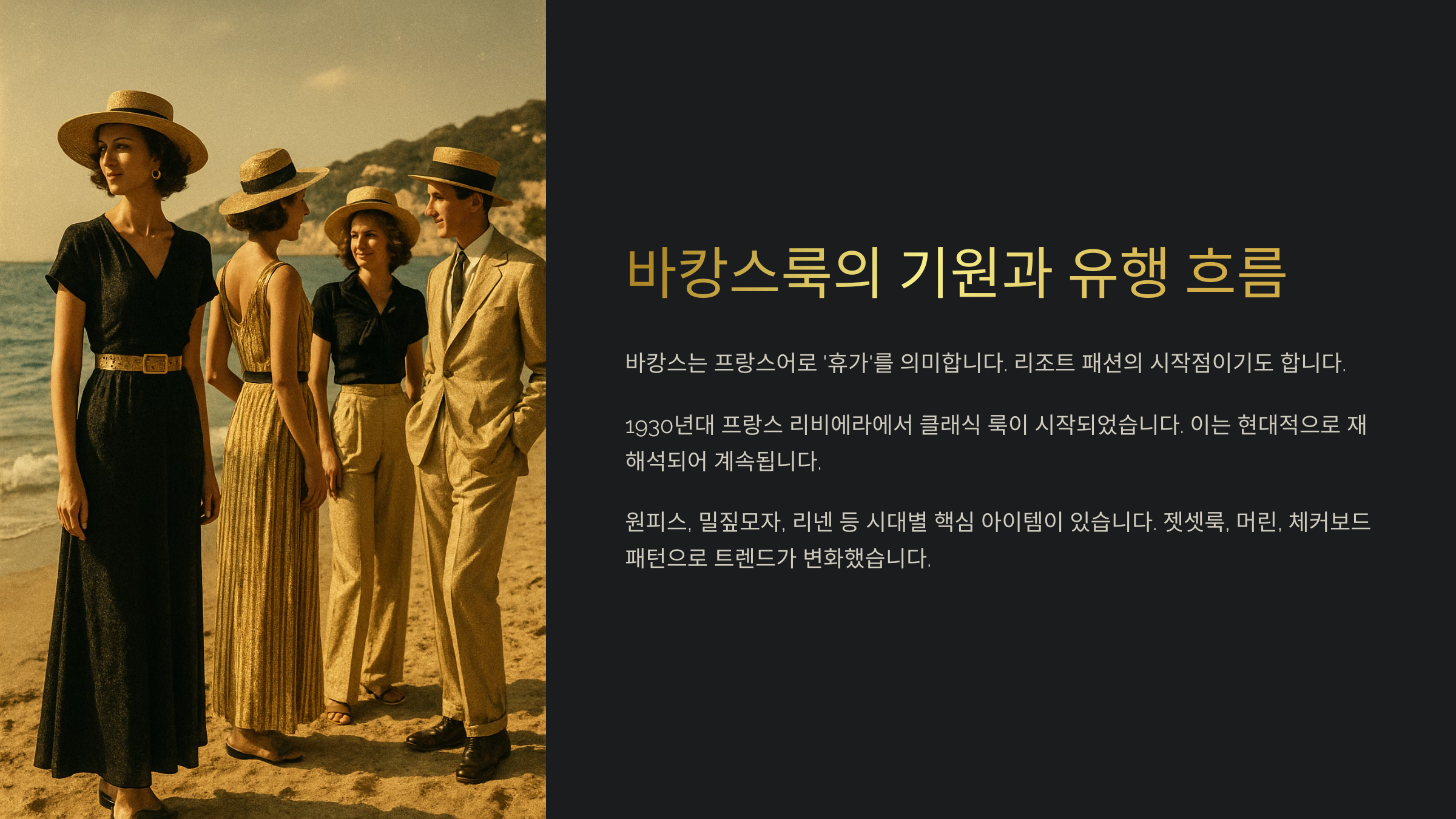 ๋ฐ์บ์ค๋ฃฉ์ด๋ผ๋ ๋ง, ์ฌ์ค ์ค๋๋ ๊ฐ๋ ์ ์๋์์. ๐ 'Vacation Look'์ด๋ผ๋ ํํ์ ์ ๋ฝ๊ณผ ๋ฏธ๊ตญ์ 1950~60๋ ๋ ๋ฆฌ์กฐํธ ๋ฌธํ์์ ์ ๋ํ์ด์. ๋น์์๋ ๊ณ ๊ธ ํธํ ๊ณผ ํด๋ณ์ ์ค๊ฐ๋ ์๋ฅ์ธต ๋ฌธํ ์์์, ์คํฌ ์ ์ธ , ๋ฆฌ๋จ ํฌ์ธ , ์ ์บก ๋ฑ์ด ์ธ๋ จ๋จ์ ์์ง์ฒ๋ผ ์ฌ๊ฒจ์ก์ฃ .