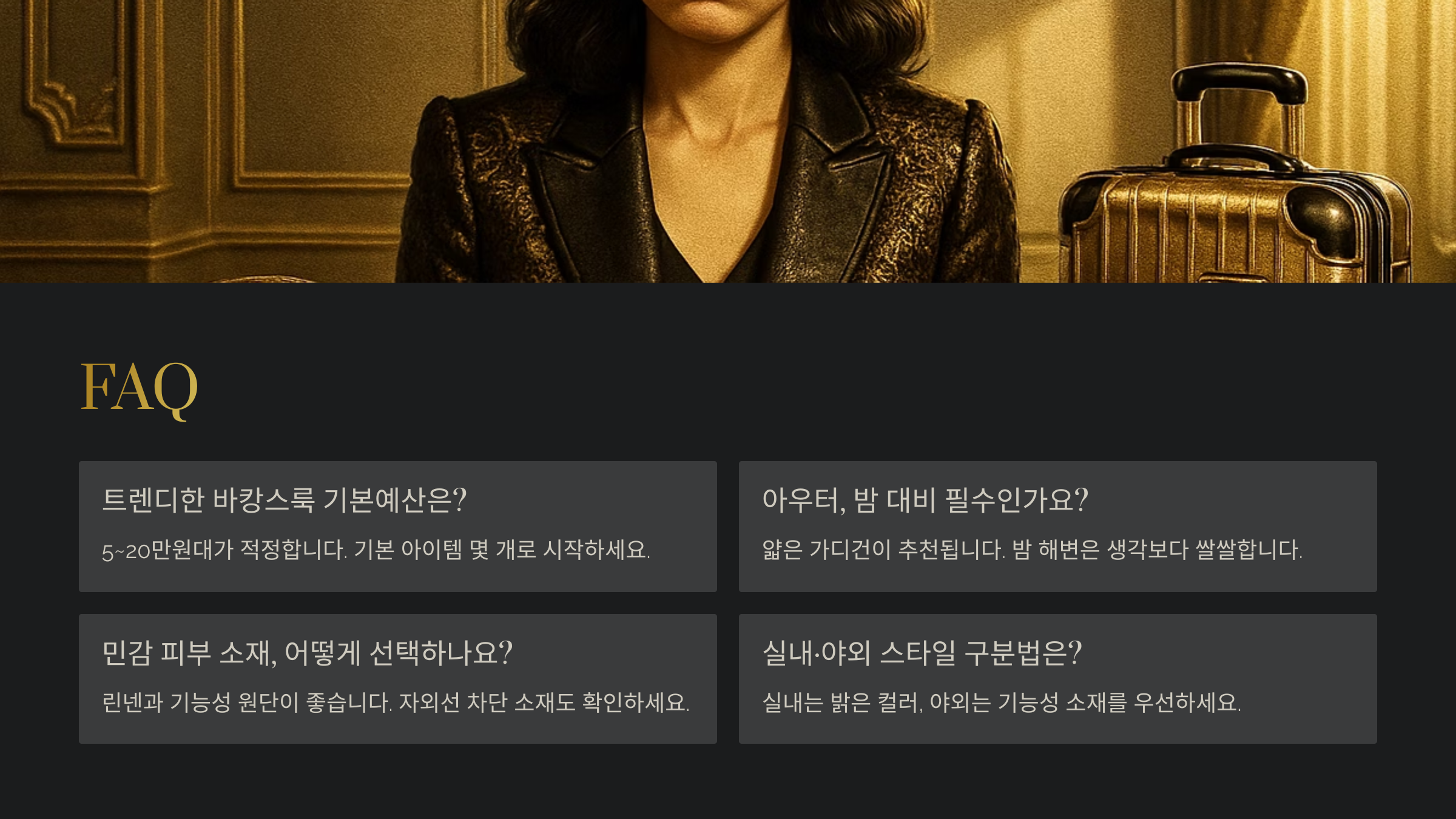 ๊ทธ๋์ ์ค๋นํ์ด์! ๊ฐ ๋ชฉ์ ์ง์ ์ํฉ์ ๋ง๋ ๋ฐ์บ์ค๋ฃฉ ์์ดํ ์ ๋น๊ตํด์ ์ ๋ฆฌํ ํ์์. ์ด ํ ํ๋๋ฉด, ์ท๋ถํฐ ๊ฐ๋ฐฉ, ์ ๋ฐ๊น์ง ํ๋์ ์คํ์ผ๋ง ์์ฑํ ์ ์์ด์!