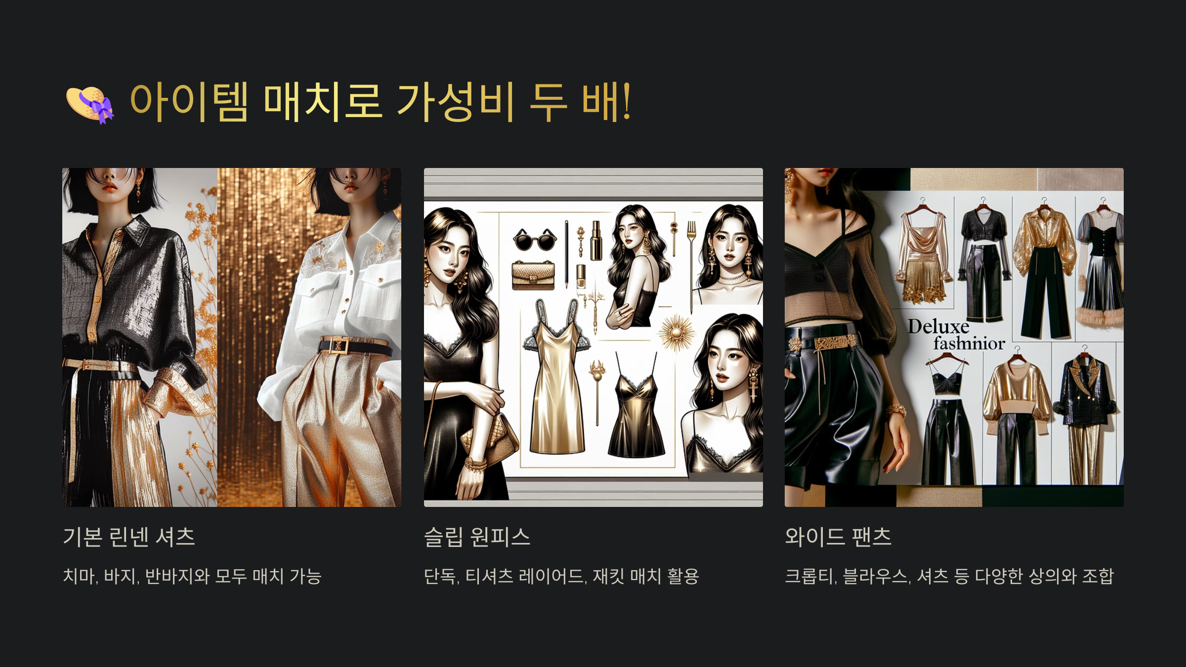 | 슬립 원피스 | 티셔츠와 레이어드 | 단독 착용 + 액세서리 |