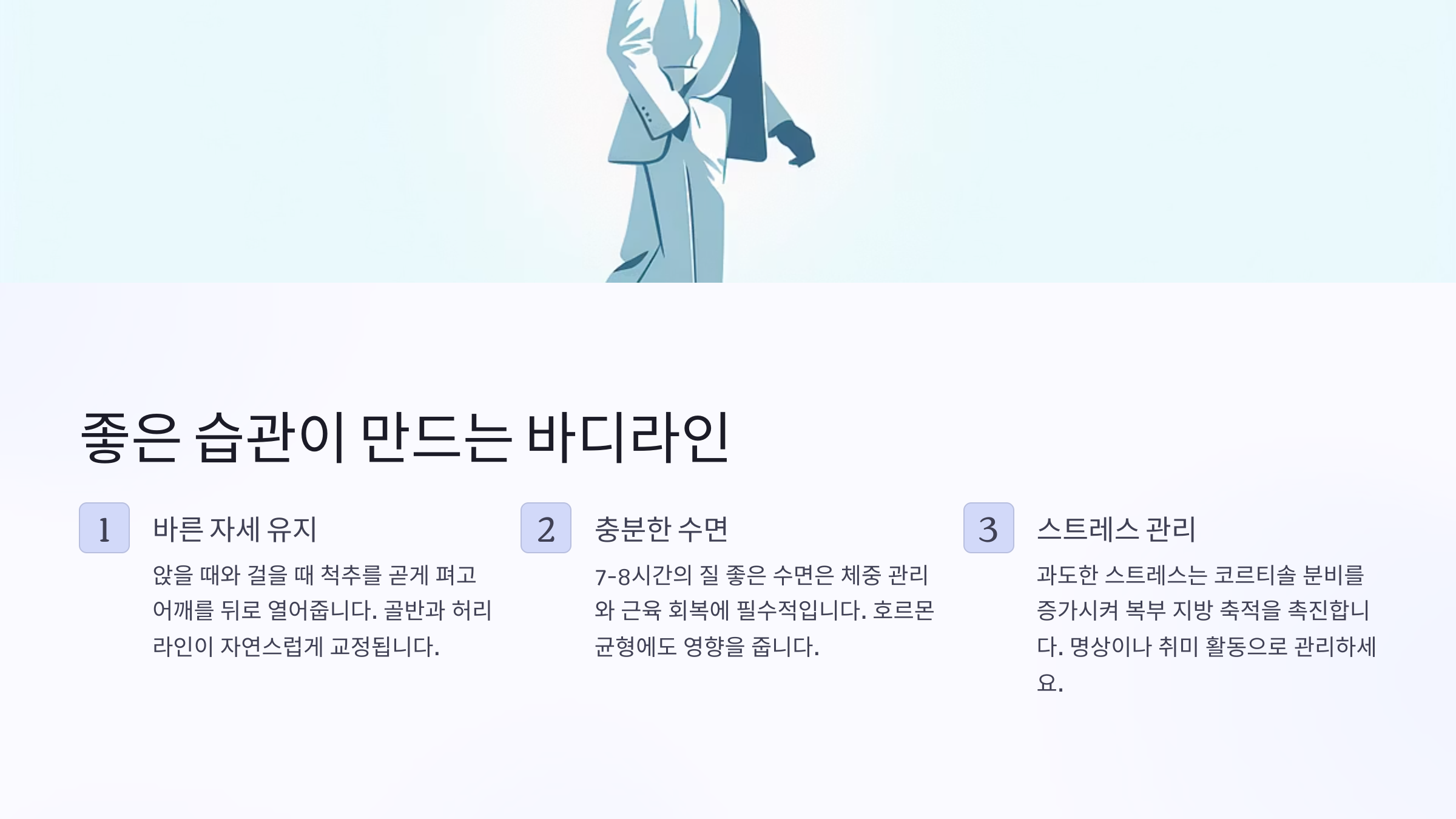 ์์ธ๋ ๋งค์ฐ ์ค์ํด์. ๊ฑฐ๋ถ๋ชฉ, ๊ตฝ์ ์ด๊นจ, ํ์ด์ง ๊ณจ๋ฐ์ ์ ์ฒด์ ์ธ ๋ฐ๋๋ผ์ธ์ ๋ง์น๋ ์ฃผ๋ฒ์ด์์. ์ ์์ ๋ ๋ณต๋ถ์ ํ์ ์ฃผ๊ณ , ์์ ๋๋ ํ๋ฆฌ๋ฅผ ๊ณง๊ฒ ํด๋ ๊ฒ๋ง์ผ๋ก๋ ๋ณต๋ถ์ ์๊ทน์ด ๊ฐ๊ณ ํ๋ฆฌ ๋ผ์ธ์ด ์๋ป์ ธ์. ์ต๊ด์ด ๋๋ฉด ์ฒดํ ์์ฒด๊ฐ ๋ฌ๋ผ์ง๋ต๋๋ค.