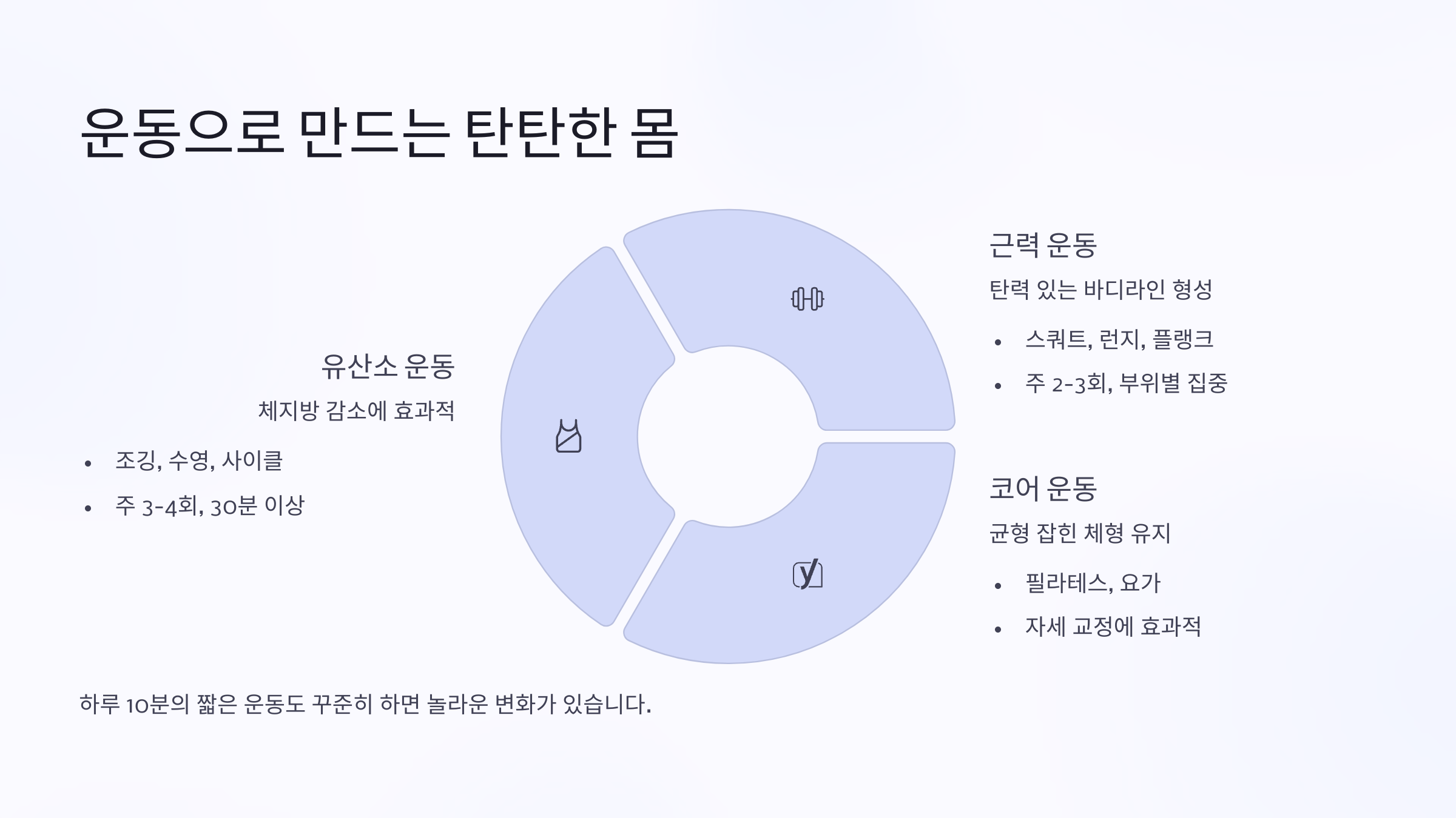 ์ด๋์ ์ ์ฐ์์ ๊ทผ๋ ฅ์ด๋์ ๊ท ํ ์๊ฒ ๋ณํํ๋ ๊ฒ ์ข์์. ์ ์ฐ์๋ ์ฒด์ง๋ฐฉ์ ์ค์ด๊ณ , ๊ทผ๋ ฅ์ด๋์ ๊ทผ์ก์ ๋ชจ์์ ๋ค๋ฌ๋ ์ญํ ์ ํด์. ๋ ์ค ํ๋๋ง ํด์๋ ์์ฑ๋ ๋์ ๋ผ์ธ์ ๋ง๋ค๊ธฐ ์ด๋ ต๋ต๋๋ค.