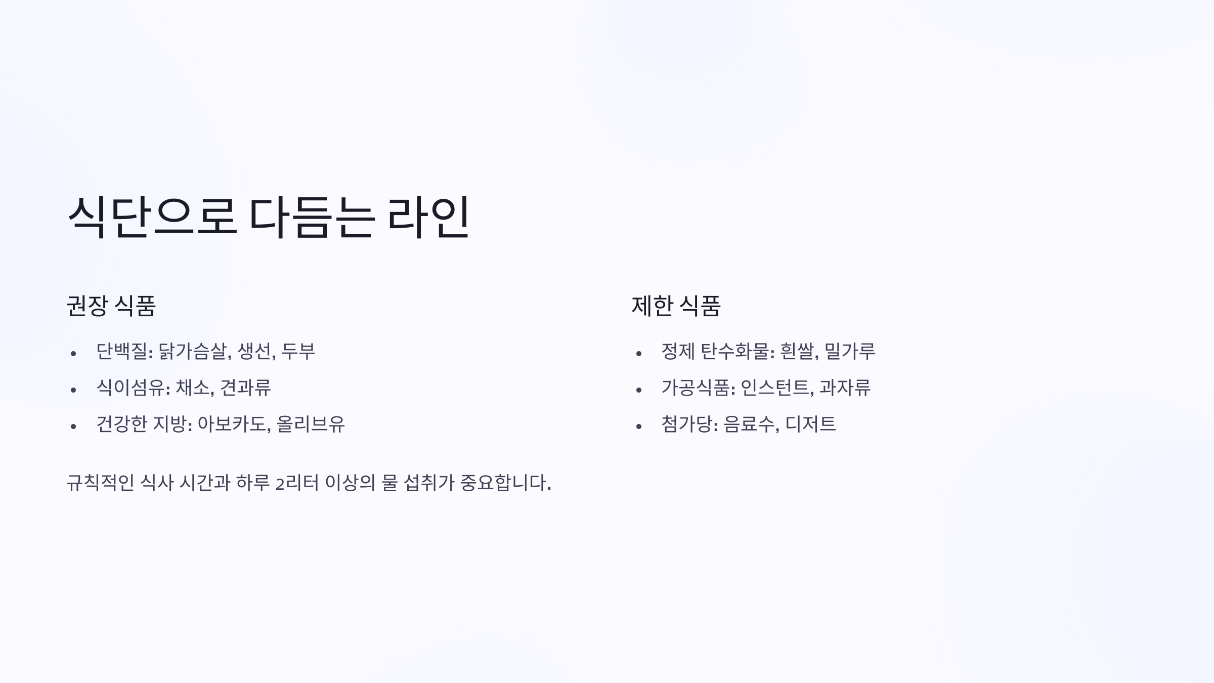์ด๋๊ณผ ์๋จ๋ง์ผ๋ก๋ ์๋ฒฝํ ๋ฐ๋๋ผ์ธ์ ์ ์งํ๊ธฐ ์ด๋ ค์์. ์ผ์ ์์์ ๋ฐ๋ณต๋๋ ์์ ์ต๊ด๋ค์ด ๋ฐ๋๋ผ์ธ์ ํฐ ์ํฅ์ ์ค๋ต๋๋ค. ํนํ ์๋ฉด, ์์ธ, ์คํธ๋ ์ค ๊ด๋ฆฌ ๋ฑ์ ๋ชธ๋งค๋ฟ๋ง ์๋๋ผ ์ผ๊ตด ์ ๊น์ง ๋ฌ๋ผ์ง๊ฒ ํด์.