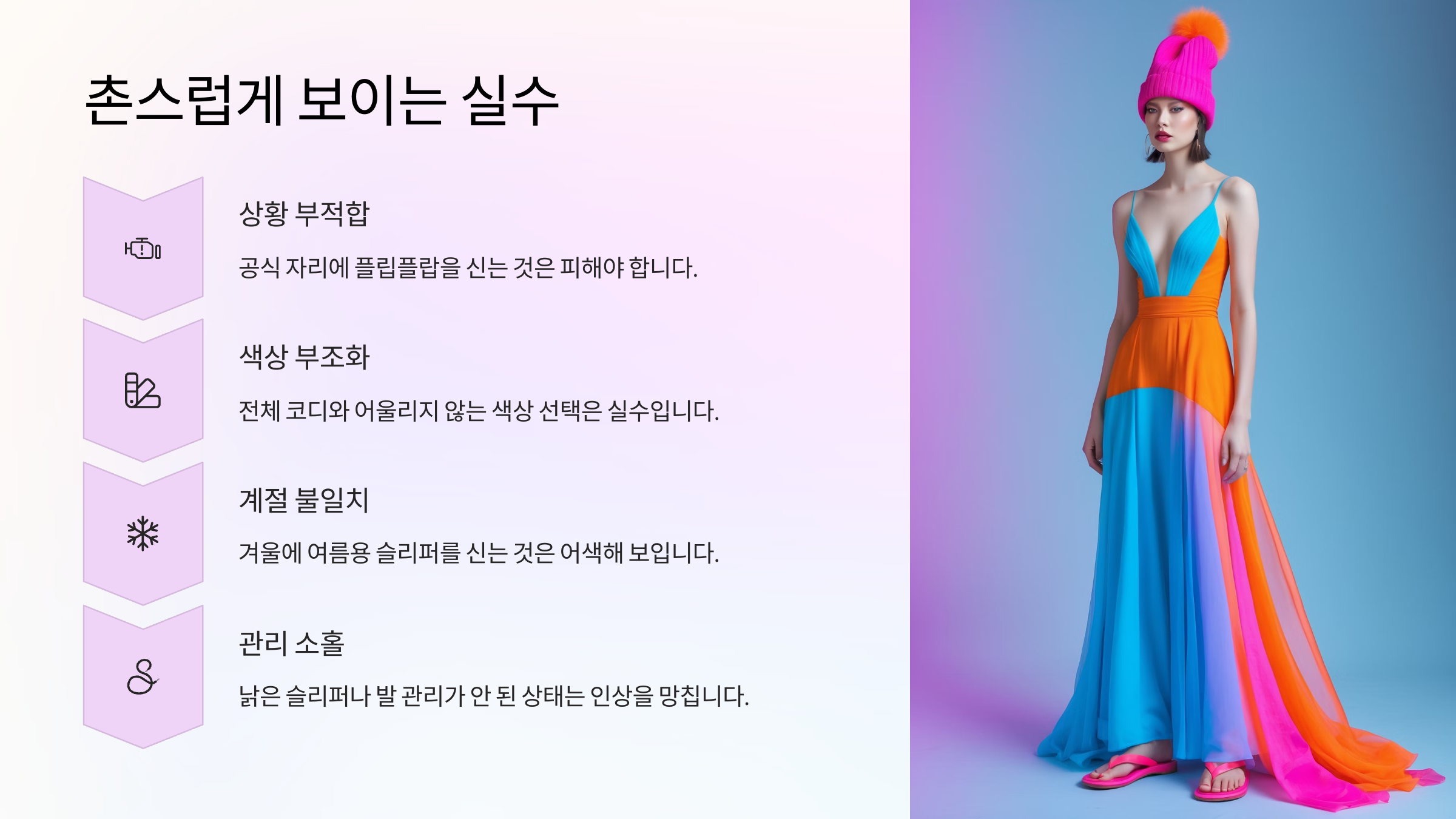 ์ธ ๋ฒ์งธ๋ **์ฌ๋ฆฌํผ์ ๋๋ฌด ํฌ๋ฉํ ์ท**์ ๋งค์นํ๋ ๊ฑฐ์์. ์ํธ์ ์ชผ๋ฆฌ๋ฅผ ์ ์ผ๋ฉด ์ด์ค๊ฐํ ๋ถ์๊ธฐ๊ฐ ๋ผ์. ๊ฒฉ์๊ณผ ํธ์ํจ ์ฌ์ด ๋ฐธ๋ฐ์ค๋ฅผ ์ ๋ง์ถฐ์ผ ํด์.