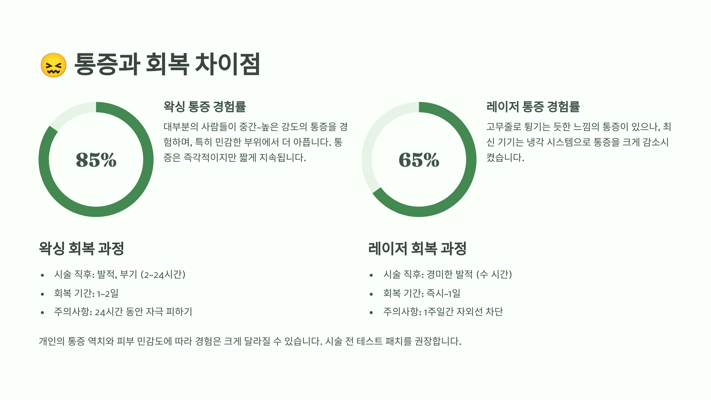 ๋ค์์ ๋ ์์ ๋ฐฉ์์ ํต์ฆ๊ณผ ํ๋ณต ๊ธฐ๊ฐ์ ์ ๋ฆฌํ ๋น๊ตํ์์!
