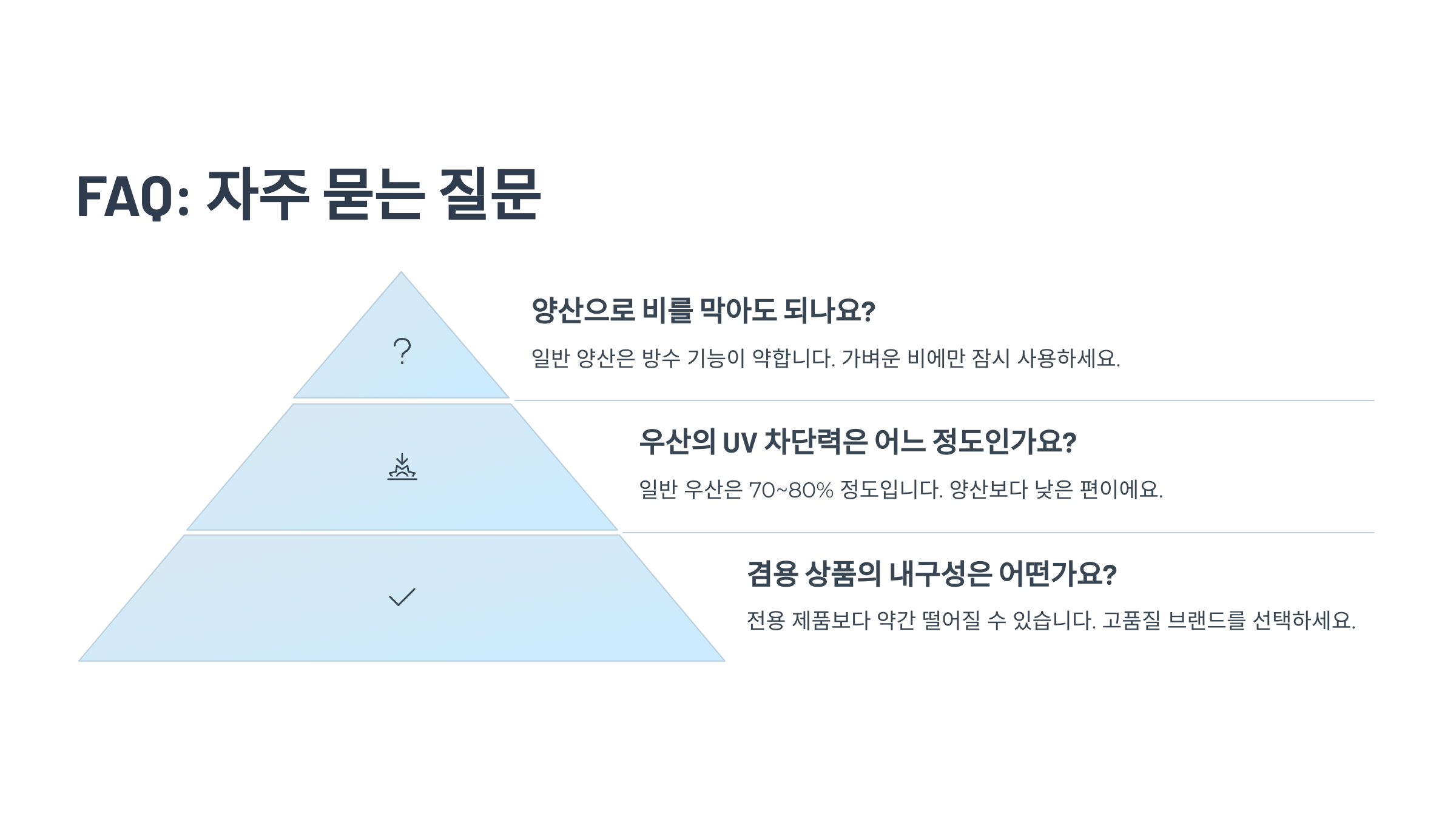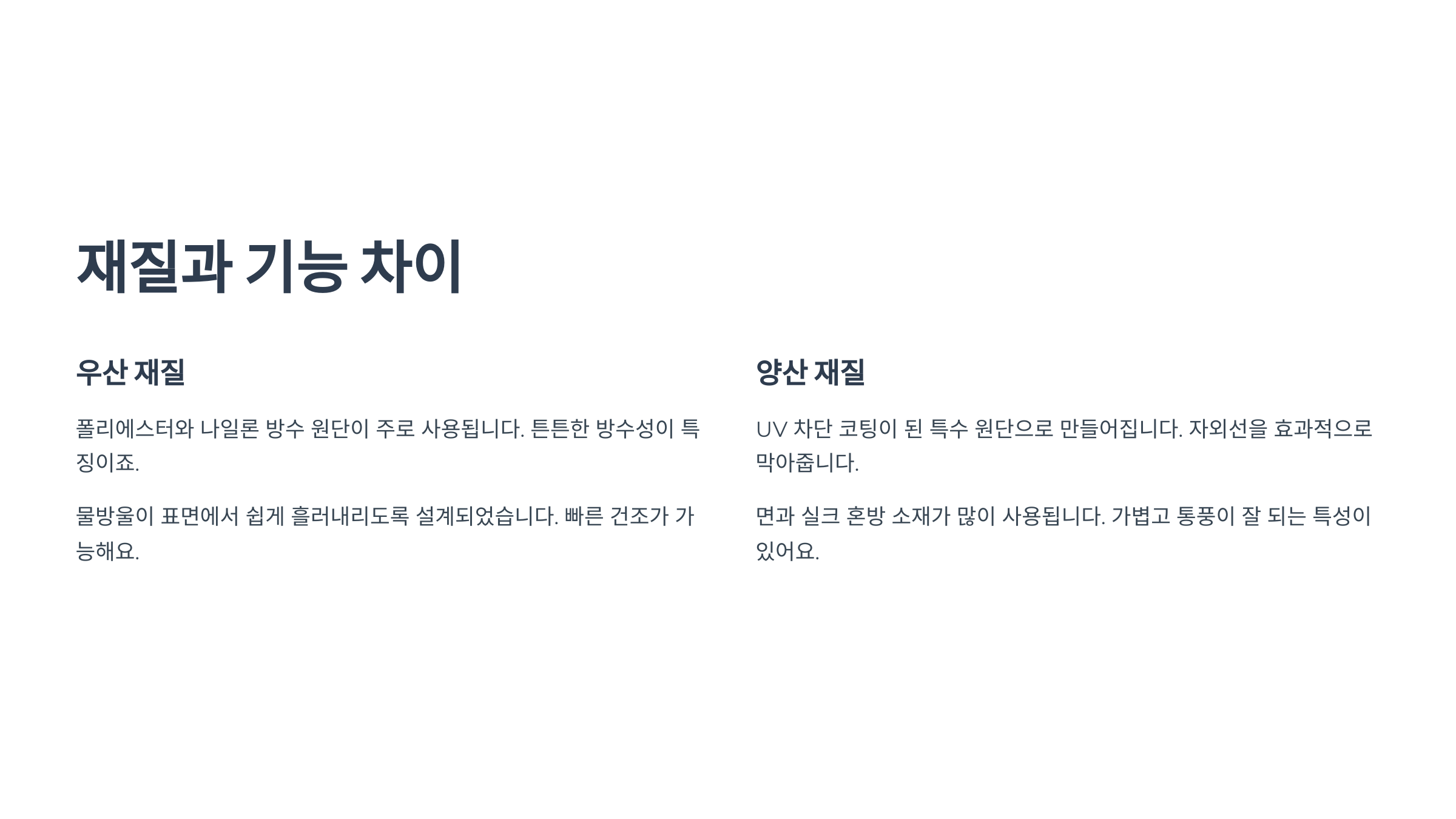 ์ฐ์ฐ๊ณผ ์์ฐ์ ์ธํ์ ๋น์ทํ์ง๋ง ์ฌ์ฉํ๋ ์์ฌ๋ถํฐ ์ฐจ์ด๊ฐ ์์ด์. ๋น๋ฅผ ๋ง๊ธฐ ์ํ ์ฐ์ฐ์ ๋ณดํต ๋ฐฉ์ ์ฑ๋ฅ์ด ์ค์ํ๋ฐ์, ์ฃผ๋ก ํด๋ฆฌ์์คํฐ๋ ๋์ผ๋ก ์์ฌ๋ก ๋ง๋ค์ด์ ธ์ ๋ฌผ๋ฐฉ์ธ์ด ์ ํ๊ฒจ ๋๊ฐ์. ๋ฐ๋ฉด, ์์ฐ์ ํ๋น ์ฐจ๋จ์ด ๋ชฉ์ ์ด๋ผ์ UV ์ฝํ ์ด ๋์ด ์๊ฑฐ๋, ์์ธ์ ์ฐจ๋จ์จ์ด ๋์ ๊ณ ๋ฐ๋ ์๋จ์ ์ฌ์ฉํด์.
