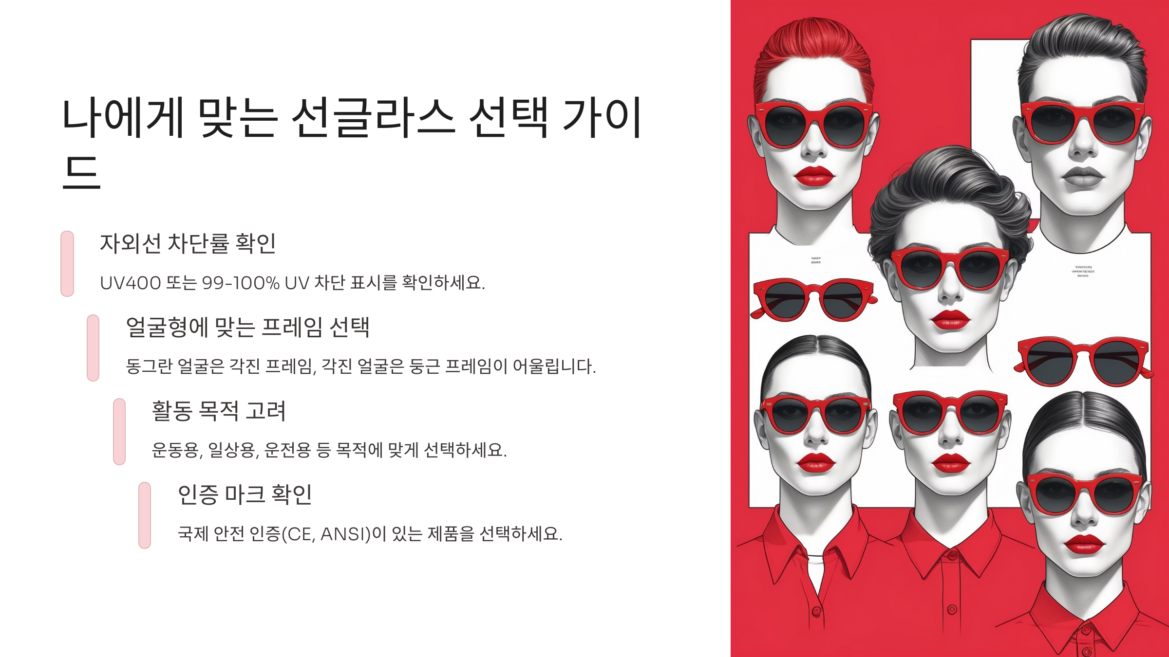๋ด๊ฐ ์๊ฐํ์ ๋, ์ ๋ง ์ค์ํ ๊ฑด UV ์ฐจ๋จ ์ง์(UV400 ์ฌ๋ถ)๋ฅผ ๊ผญ ํ์ธํ๋ ๊ฑฐ์์. UV400์ 400๋๋ ธ๋ฏธํฐ๊น์ง ์์ธ์ ์ ์๋ฒฝํ ์ฐจ๋จํ๋ค๋ ๋ป์ด์ฃ . ๋ ์ฆ ์์๋ง ๋ณด๊ณ ์ฐฉ๊ฐํ๋ฉด ์ ๋๊ณ , UV ์ฐจ๋จ ์์น๋ฅผ ๋ฐ๋์ ํ์ธํด์ผ ํด์!
