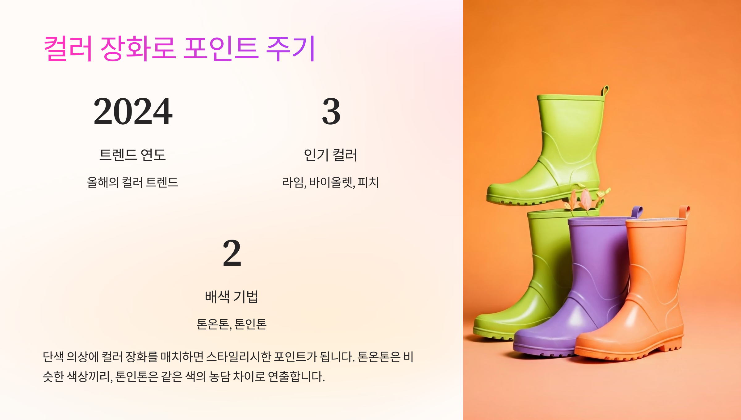 λν μ₯νμ 컬λ¬λ₯Ό ν¬μΈνΈλ‘ μ΄λ¦΄ μ μμ΄μ. λ λ, λ―ΌνΈ, μλ‘μ° κ°μ μ»¬λ¬ μ₯νλ μ 체 μ½λκ° ν€ λ€μ΄λμ λ λ± λμ λλ ν¬μΈνΈκ° λΌμ. μΆκ·Όλ£©μ κ°μ±μ λν΄μ€λ΅λλ€.