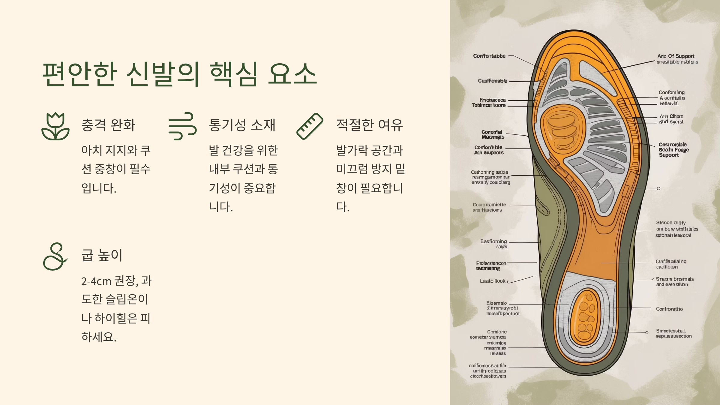 ๋ํ ๋ฐ๋ฐ๋ฅ ์์น๋ฅผ ์ ์ง์งํด์ฃผ๋ ‘์์น ์ํฌํธ’๊ฐ ๋ด์ฅ๋์ด ์๋์ง๋ ๋งค์ฐ ์ค์ํด์. ์์น๊ฐ ๋ฌด๋์ง๋ฉด ๋ฐ๋ฐ๋ฅ ํต์ฆ์ด ์ฌํด์ง๊ณ ์์ธ๋ ํํธ๋ฌ์ง๊ฑฐ๋ ์.