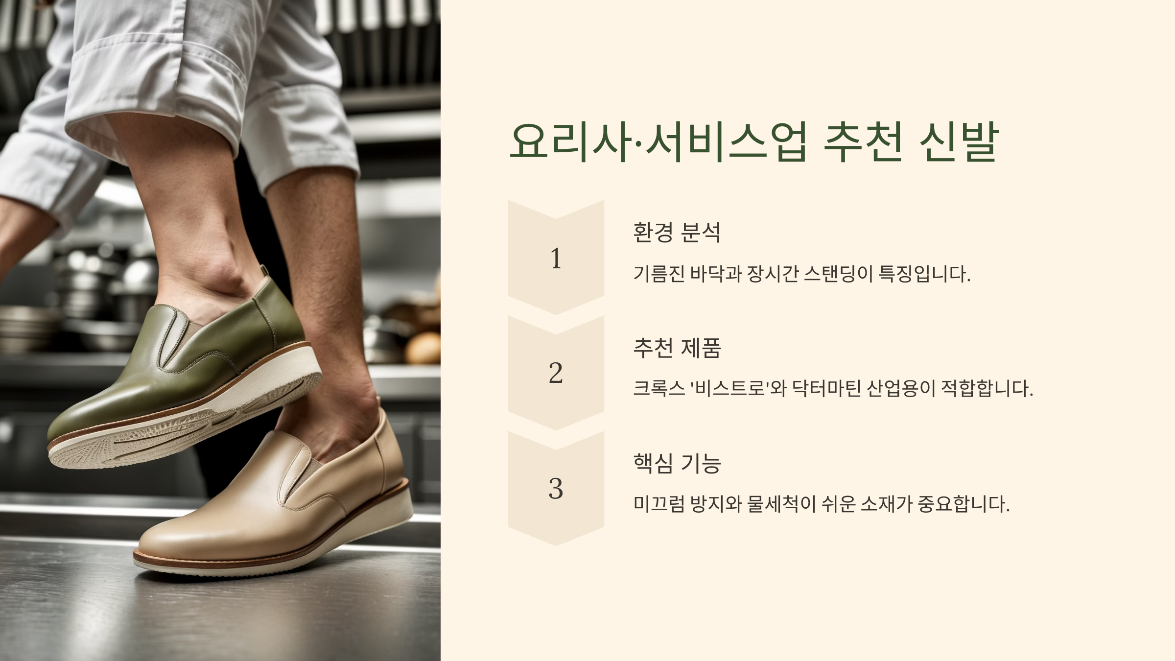 ์ฃผ๋ฐฉ์์ ํ๋ฃจ ์ข ์ผ ์ผํ๊ฑฐ๋, ๋งค์ฅ์์ ์์ ์ผํ๋ ๋ถ๋ค์๊ฒ ์ค์ํ ๊ฑด **๋ฏธ๋๋ผ ๋ฐฉ์ง**์ **๋ฐฉ์**, ๊ทธ๋ฆฌ๊ณ **๋ฐ์ ํผ๋ก ์ต์ํ**์์. ๋ฐ๋ฅ์ด ๊ธฐ๋ฆ์ง๊ฑฐ๋ ๋ฌผ๊ธฐ๊ฐ ๋ง์ ๊ณณ์ด ๋ง๊ธฐ ๋๋ฌธ์ด์์.
